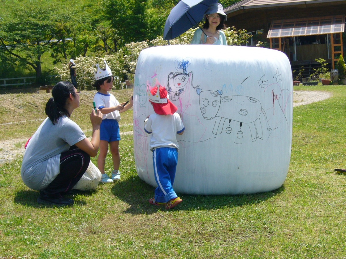 ウシの餌となる乾草ロールなどに自由にらくがきができます。