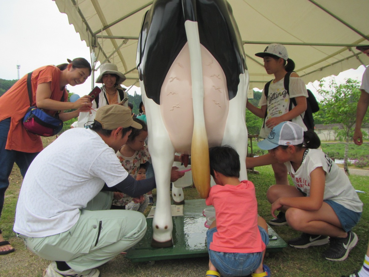 「まきばの館」内にある「牛の館」で、実物大の牛模型で牛の乳搾りが疑似体験できます。