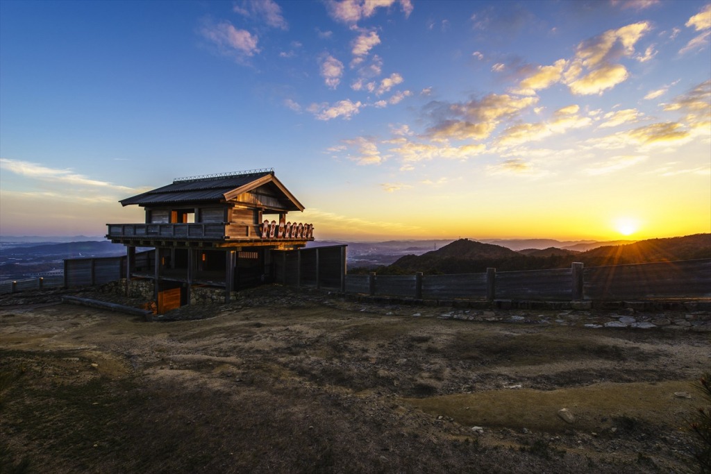 標高約400mの鬼城山山頂一帯に約2.8kmにわたって巡らされた古代の山城。実物大で復元された西門は圧巻! 城内からの排水施設である水門や、兵糧を蓄えた礎石建物跡なども見られます。昔話「ももたろう」の原形といわれる「温羅(うら)伝説」の地。