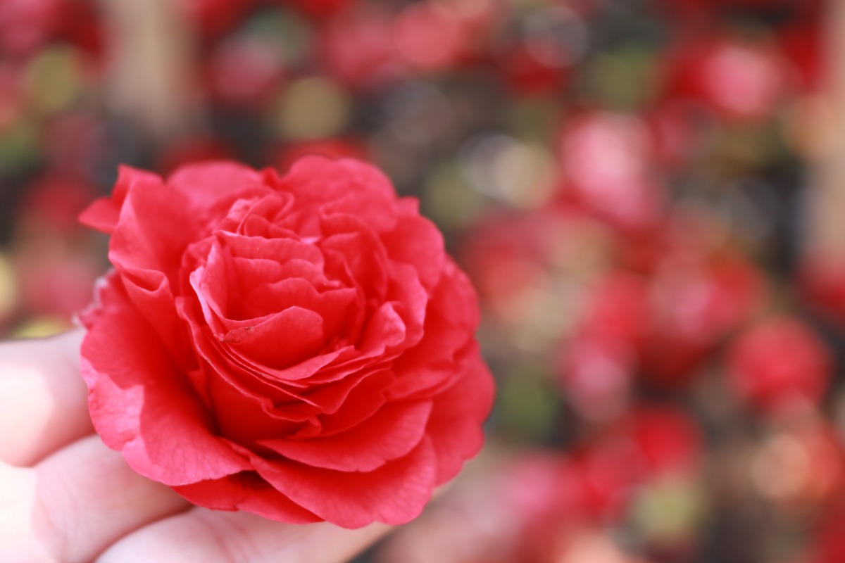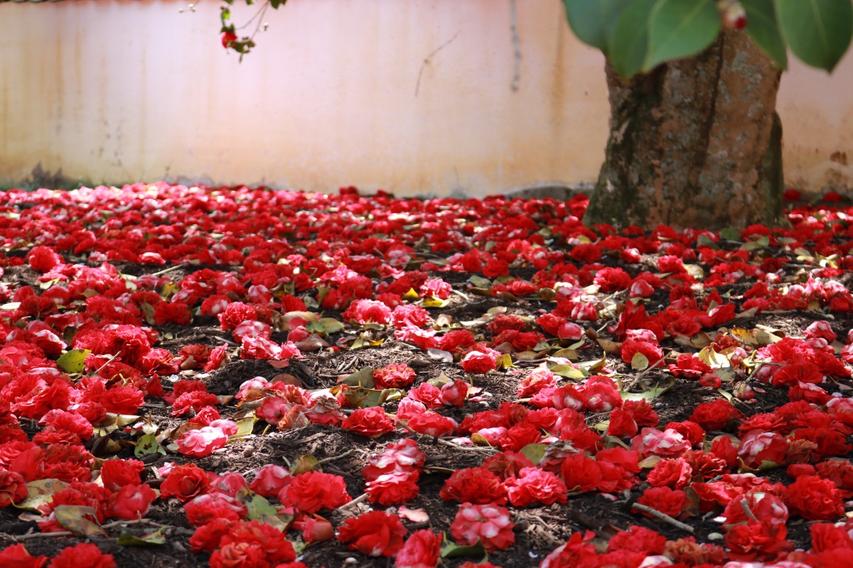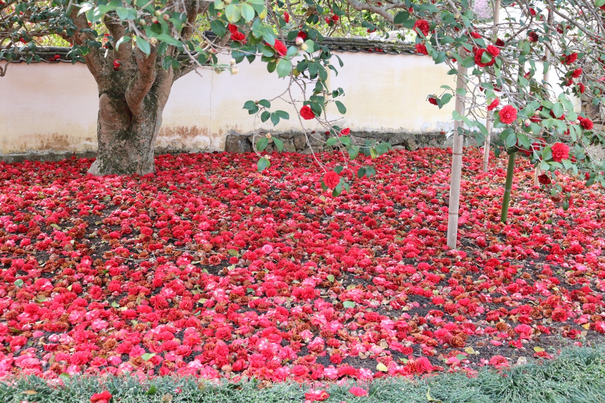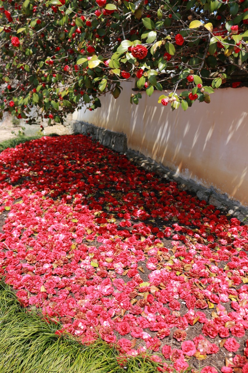 椿の花は、雨に濡れると茶色に変色します。晴れの日が続くと、落ちた椿が絨毯のようにびっしりになり、真っ赤に見えます。