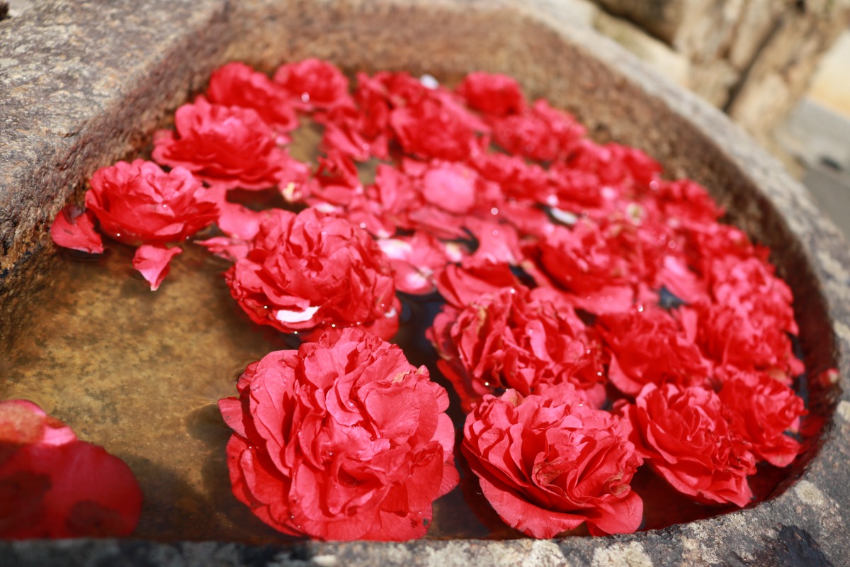 水盤に浮かぶ椿もインスタ映えします。お花を水に浮かべてあしらうのが流行っていますが、お寺のたたずまいととても合います。