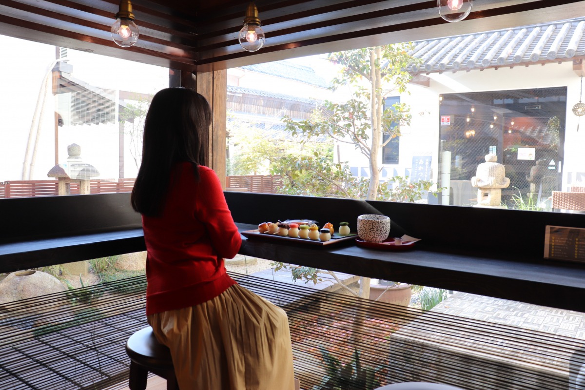 店舗設計が専門のオーナーさんが、「コーヒーに合うお団子を食べてもらいたい」とデザインされた店内は、和の空間と、中庭を眺めながらカウンターでくつろげるモダンな空間があり、とてもおしゃれなお団子カフェです。