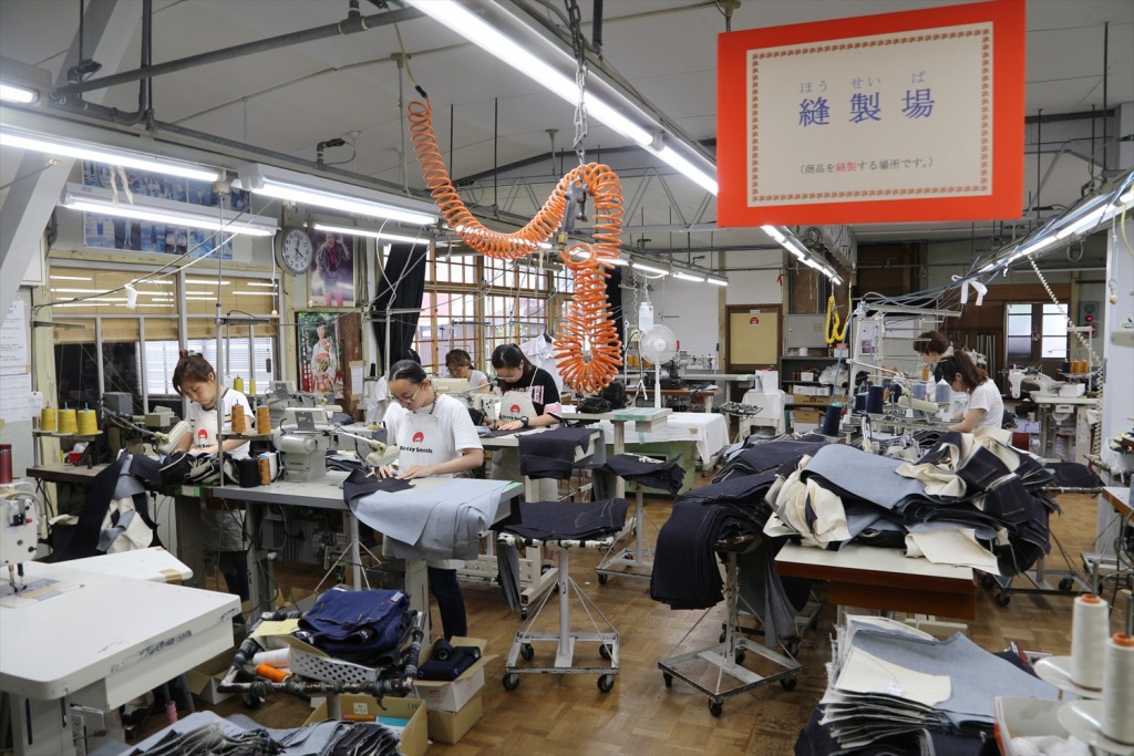 1962年設立の日本で最も古いジーンズ工場。当時の工場風景を窓ガラス越しに見学可能。