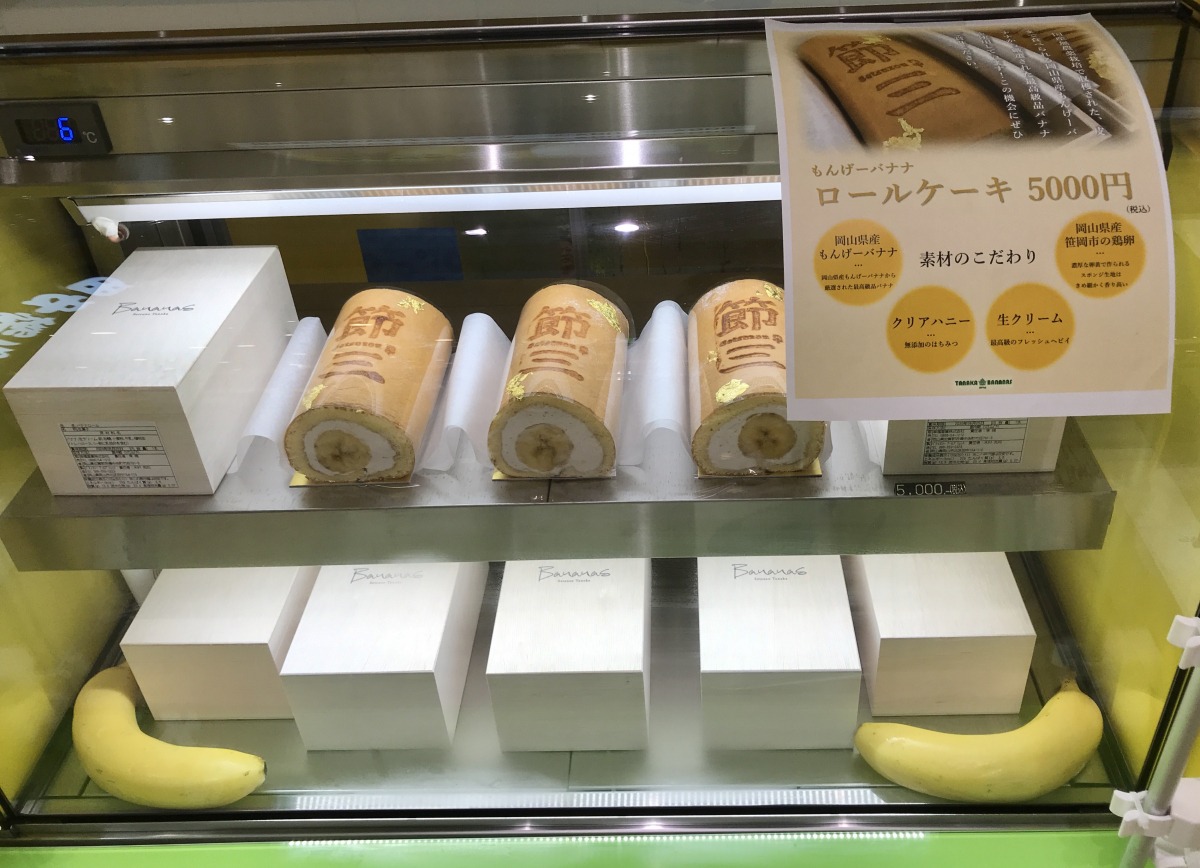 この貴重な国産・岡山産バナナと岡山の食材をぜいたくに使用し金箔をあしらった「もんげーバナナロールケーキ」は、桐箱に入った特別な逸品。贈答品としても話題になっています。