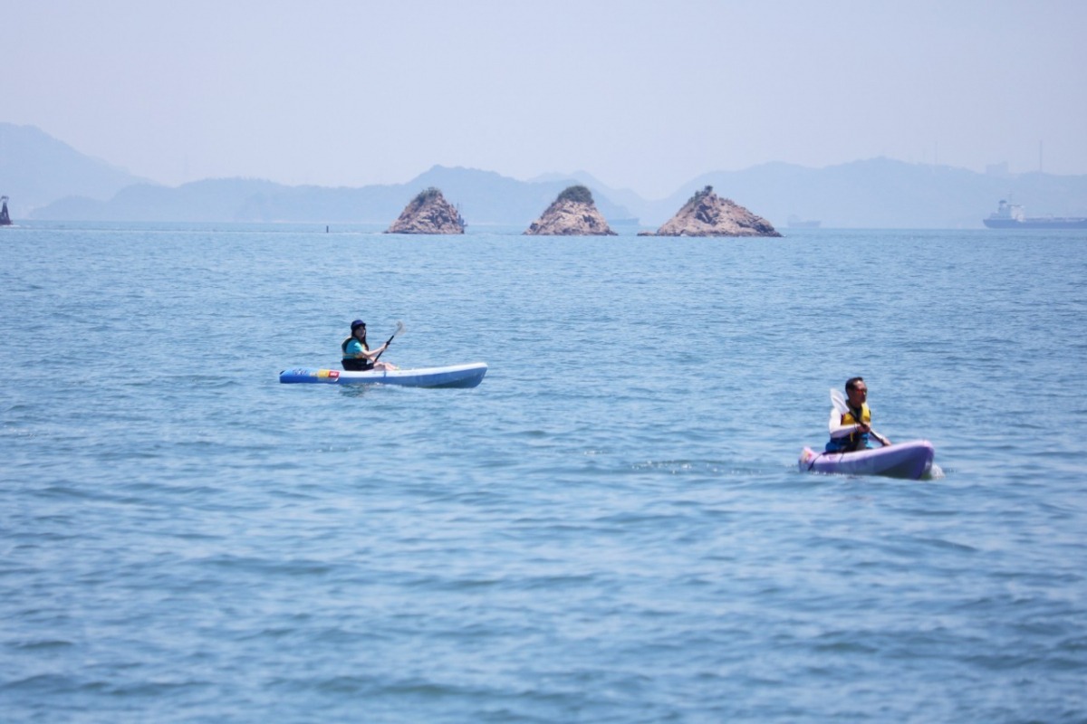 乗船し、スタッフさんにカヤックを押していただき、いよいよ海へ! 私は9歳のちひろくんとペアで漕ぎだしました。