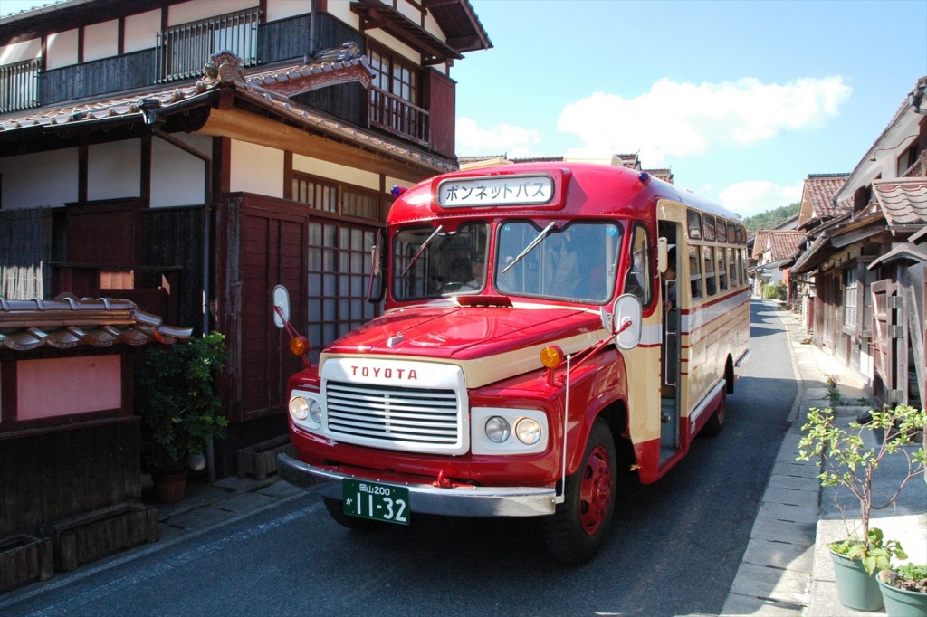 4月~6月の毎週日曜日に運行している「吹屋ふるさと村観光周遊バス」では、日本で1台しかないボンネットバス(1967年式トヨタDB100)に乗って吹屋の町をゆったり観光できます。(2日前までに要予約)