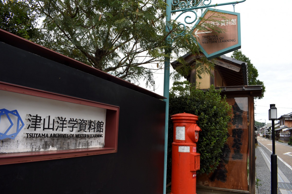 まるで小京都のような町並みの中に、昔懐かし赤ポストを発見です!五角形の展示室や、解体新書の初版本など、アートと学問の両方の視点でたのしめる洋学資料館。カフェや津山みやげの和蘭堂。そして城東観光案内所と、まさに町めぐりの中心はここですよ!と手を振ってくれているような、ガイドさん的存在です。