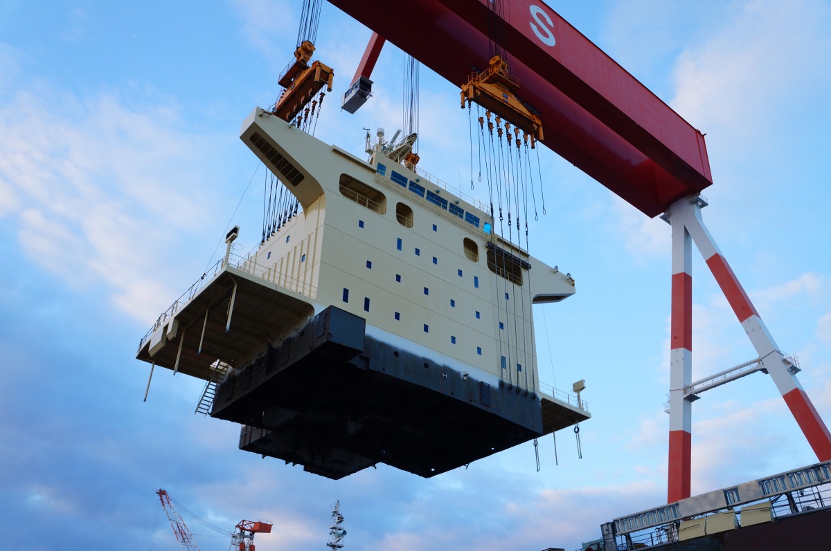 大きなプールのような、船をつくる「ドック」をすぐ間近に見ることができました。私たちが行ったときも、作りかけの船が迫力満点で待ち構えていました。船の大きさは、約230m! 石炭などを運ぶ、8万トンクラスの船が作られていました。
