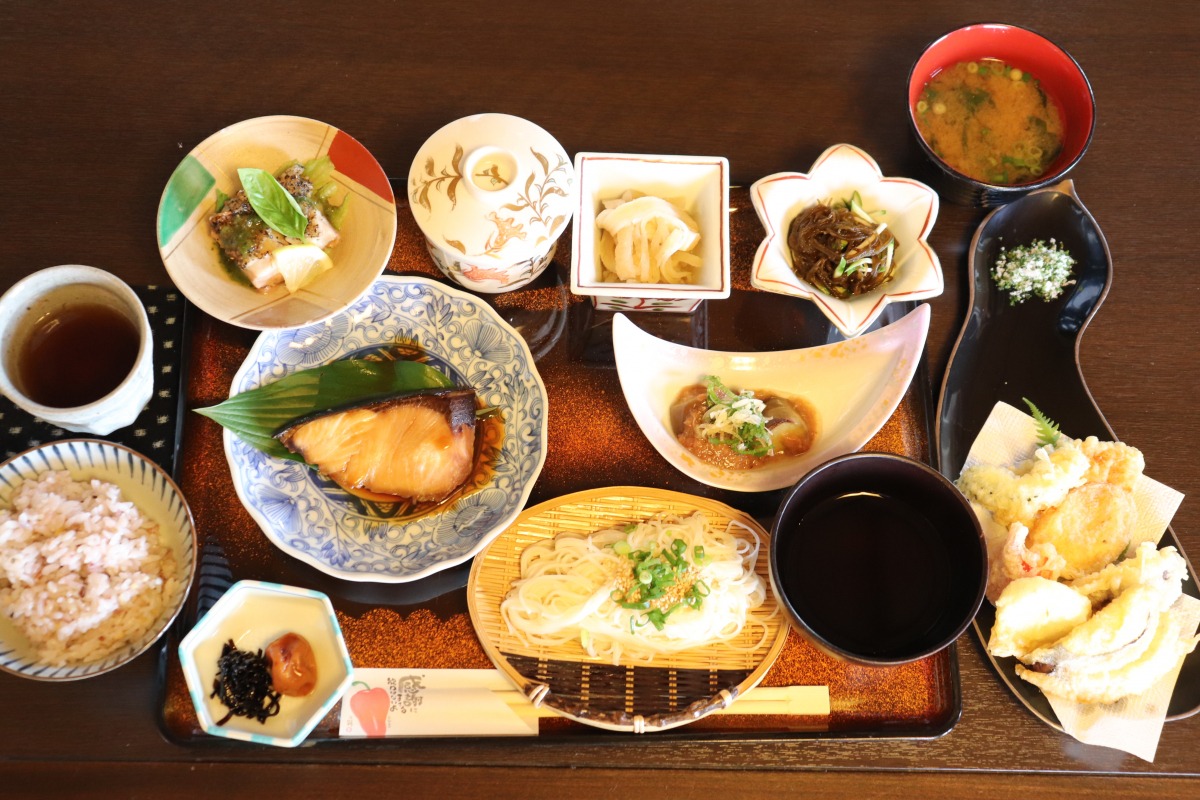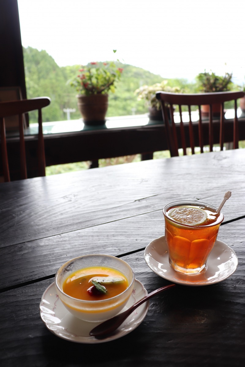 「お好きなお席にどうぞ~」と言われ、空が近くに見える和室でランチを頂きました。ニガウリ、トウガン、ヤマイモ、シイタケ、ナスビなど地元で採れた食材が煮物や天婦羅になっていて、採れたての野菜の美味しさに感動でした。スーパーで買う野菜とは、全然違います。お料理は美味しく、かなりボリューム感があり、お腹いっぱいになりました。こちらは、阿吽山房昼膳(前日までに要予約)2,000円(税別)