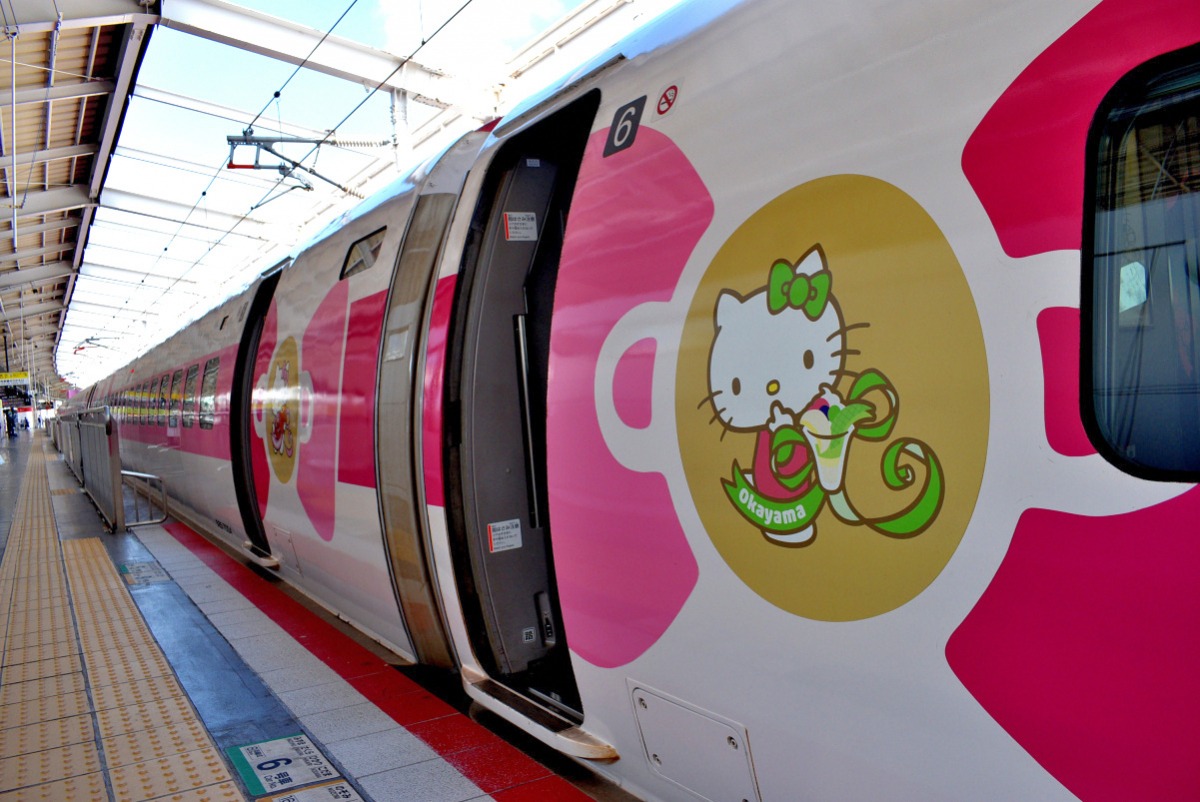 ピンクのリボンで新幹線をラッピング!キティちゃんが日本のみんなを笑顔にするために、お楽しみをいっぱい詰めこんでくれていますよ。車体に描かれた、くだもの王国・岡山のフルーツパフェや山口県のフグ、島根県のシジミなど!ご当地グルメとキティちゃんの異色のコラボも楽しさいっぱい!車内では限定グッズの購入もできます。