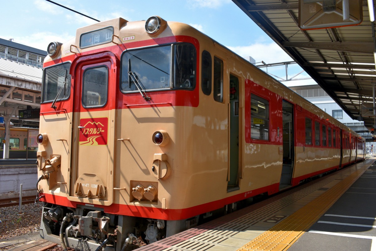 岡山の太陽を浴びてピカピカに輝く車体!2020年、国鉄急行色へと塗装が変わったばかりのノスタルジートレインです。