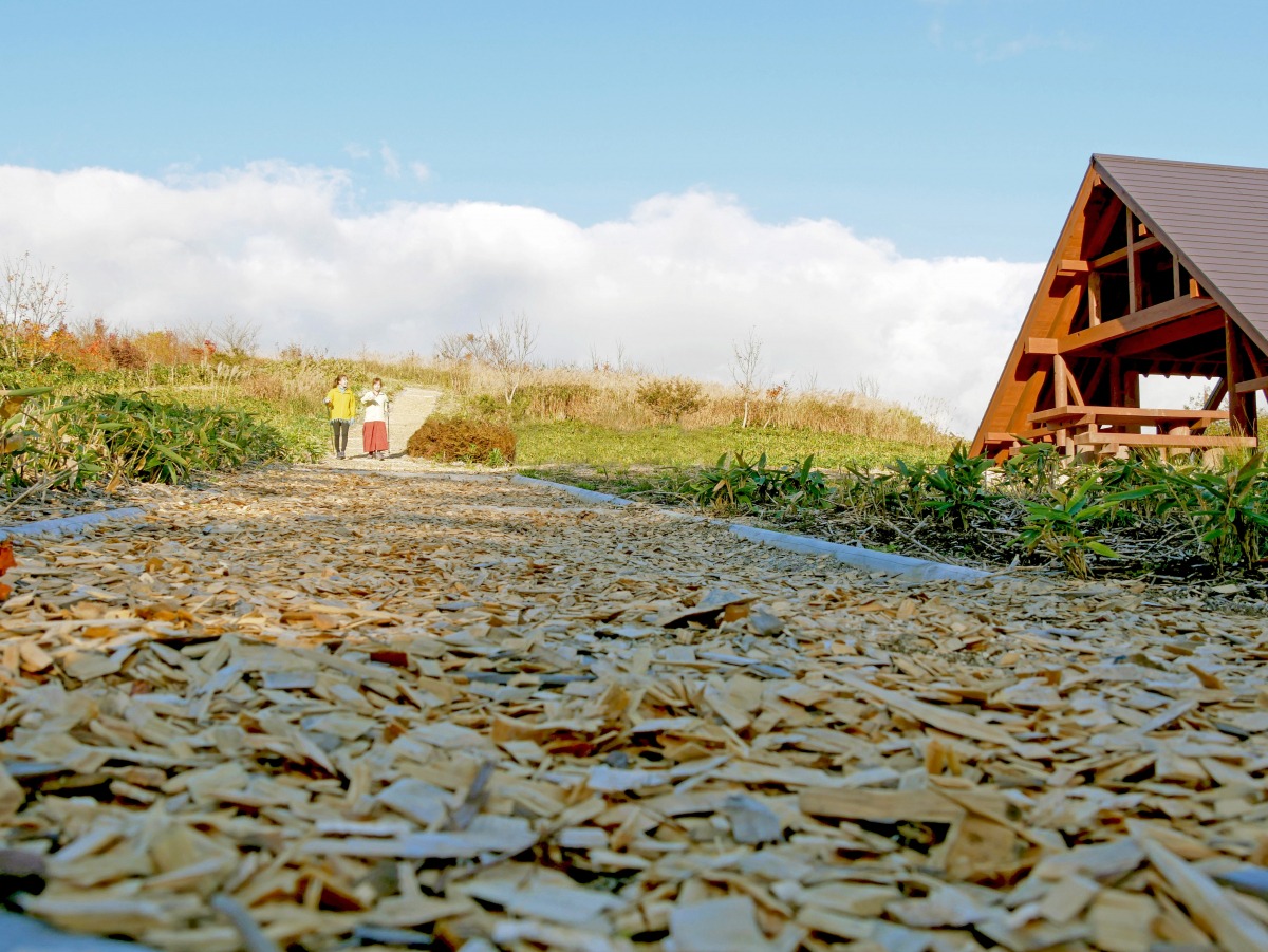 岡山県鏡野町と鳥取県三朝町の県境の尾根に沿ったトレッキングコースで、標高735mの人形峠を発着点に、標高950mの高清水高原や1,044mの伯州山などを歩くことができます。木のチップが敷き詰められたふかふかのコースは足腰に優しく、初心者でも気軽に楽しめるコースです。