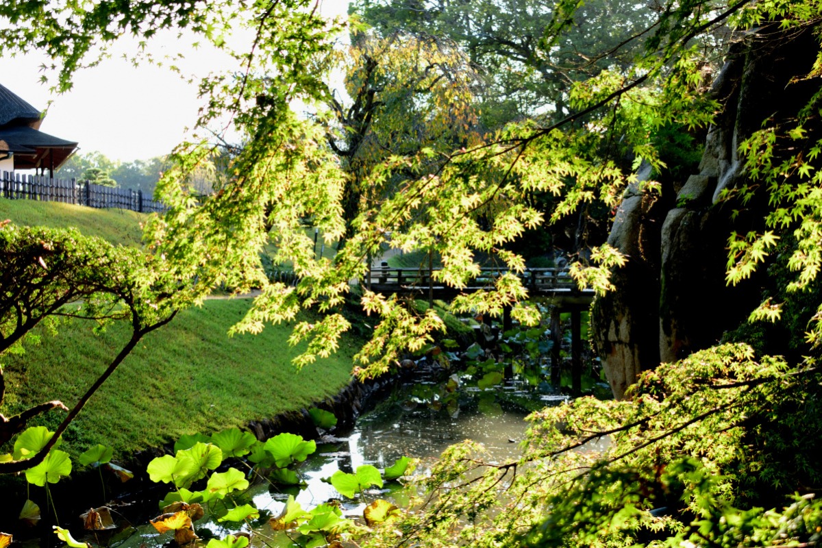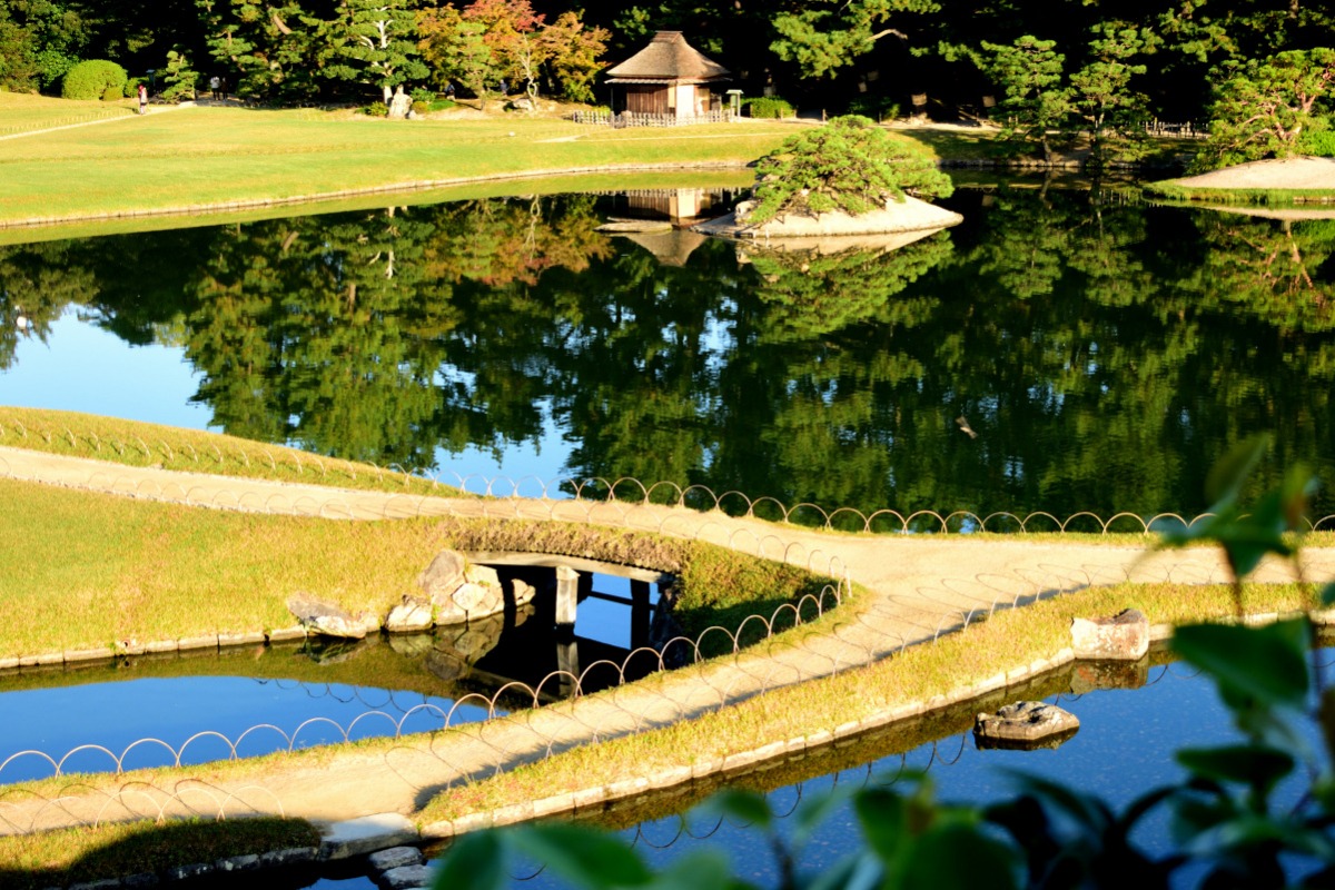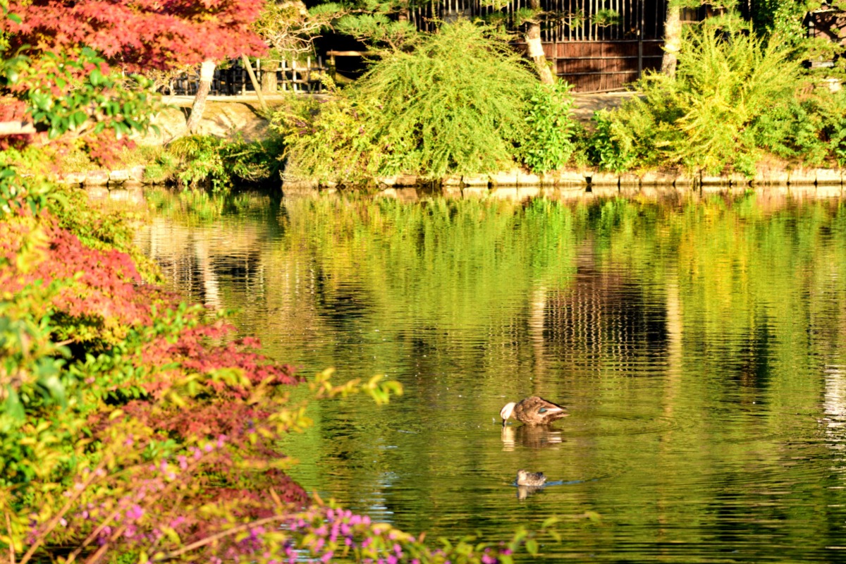 東からの太陽にモミジが照らされて、キラキラ眩しい花葉の池に到着です!正門からスタートして、大きな沢の池を中心に歩いて行けば、色々なテーマのお庭を巡りながら歩いているような。つながっているのに、つながっていることを感じさせないような。自然と見事に調和した、技アリ!な後楽園を満喫することができますよ。