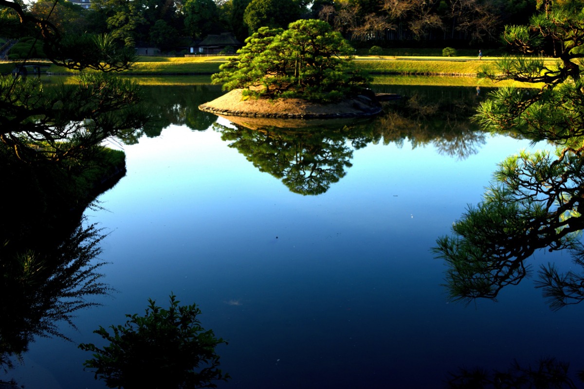 キリリとした朝の気配、刻々と変化する陰影。池の北側から眺めると、まるでブルージーンズのような青い池に見えました!池には趣の全く異なる島が3つ浮かんでいますが、その中の1つには、季節観測用標本(岡山県)のススキのある島が。他にもイチョウや桜など、園内で見られる標本植物は7種もあるんですって。