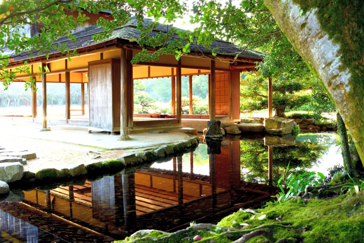 朝の陽ざしが注がれる流店は、あえて逆光になる唯心山側から眺めるのもおすすめです。壁なし!フルオープン!の独特すぎるシルエットが堪能できますよ。建物の内部に小川が流れるという、斬新な形状。眺めのために計算され尽くした、細い柱など。花鳥風月を静かに愛でたくなる、ここでしか味わえない景観に浸ってみてくださいね!