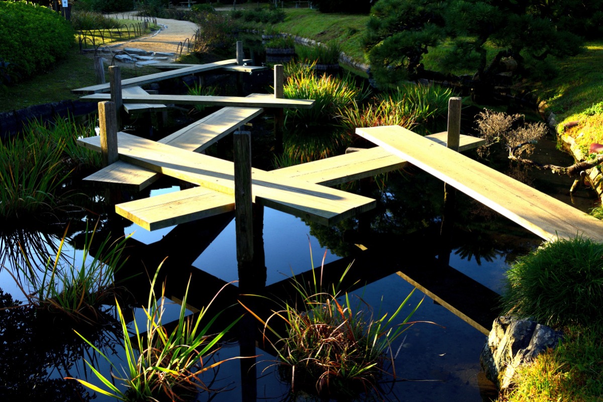 鋭角に、ランダムに、組み合わされた8枚の木板。水面から飛び出しているような不思議な立体感。伊勢物語の旅の途中に出てくる「三河の国の八橋」にちなんだ古典的な橋が、こんなにオリジナリティ溢れるデザインになるなんて!見ても、渡っても、楽しめますよ。