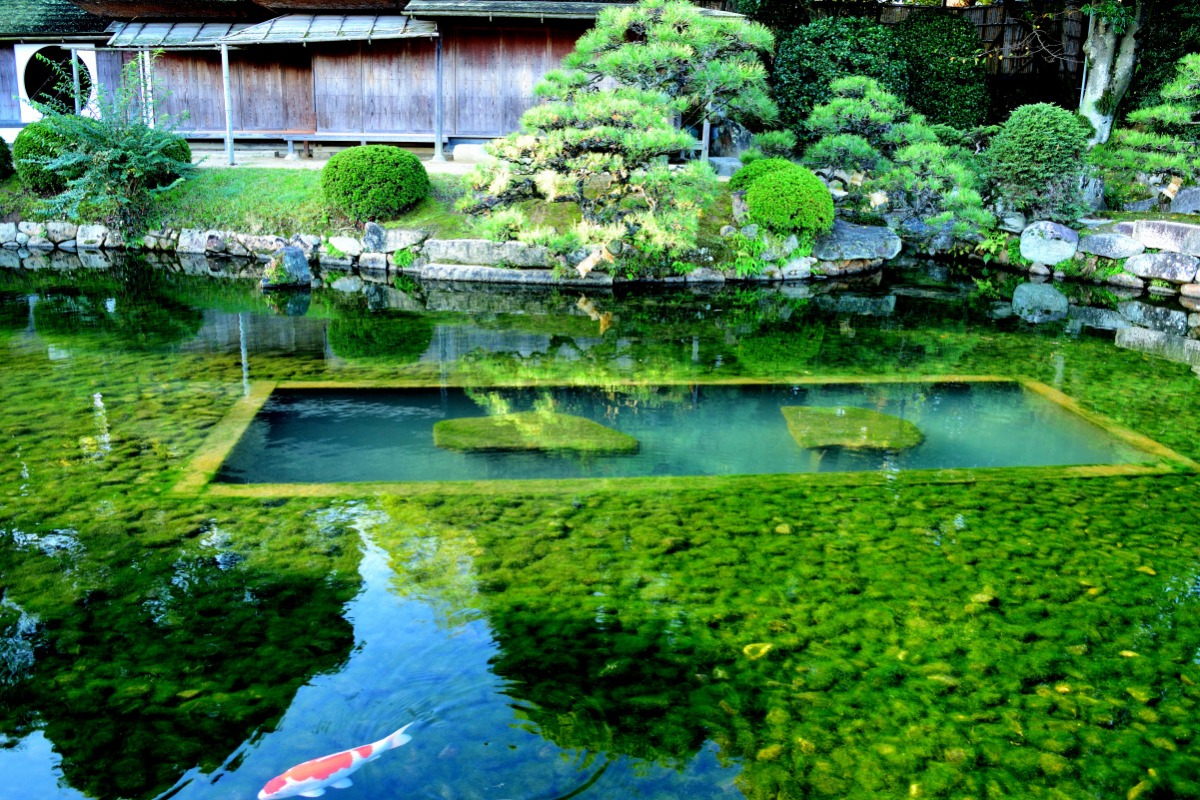 竹飾りの丸窓。くの字につながった石の橋。池のニシキゴイまでも苔色に映えて、アートな世界観を演出しています!深い緑色を眺めていたら、何だかお抹茶でもいただきたくなってきました。廉池軒のさざ波茶屋(8:30~)でも、池向かいの福田茶屋(9:30~)でも。お好きな茶屋で一服どうぞ。