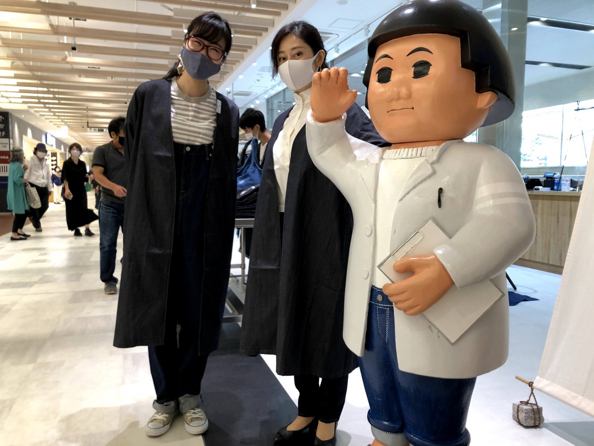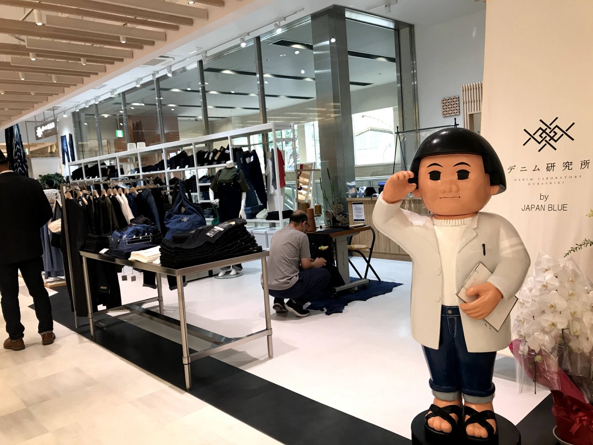 倉敷美観地区の風情ある町並みに馴染む古民家の「デニム研究所」とはまた趣向が変わり、さんすて岡山店は近未来のラボのよう。店頭で出迎える桃太郎像も、研究所だけに白衣をまとった研究員の姿で出迎えています。