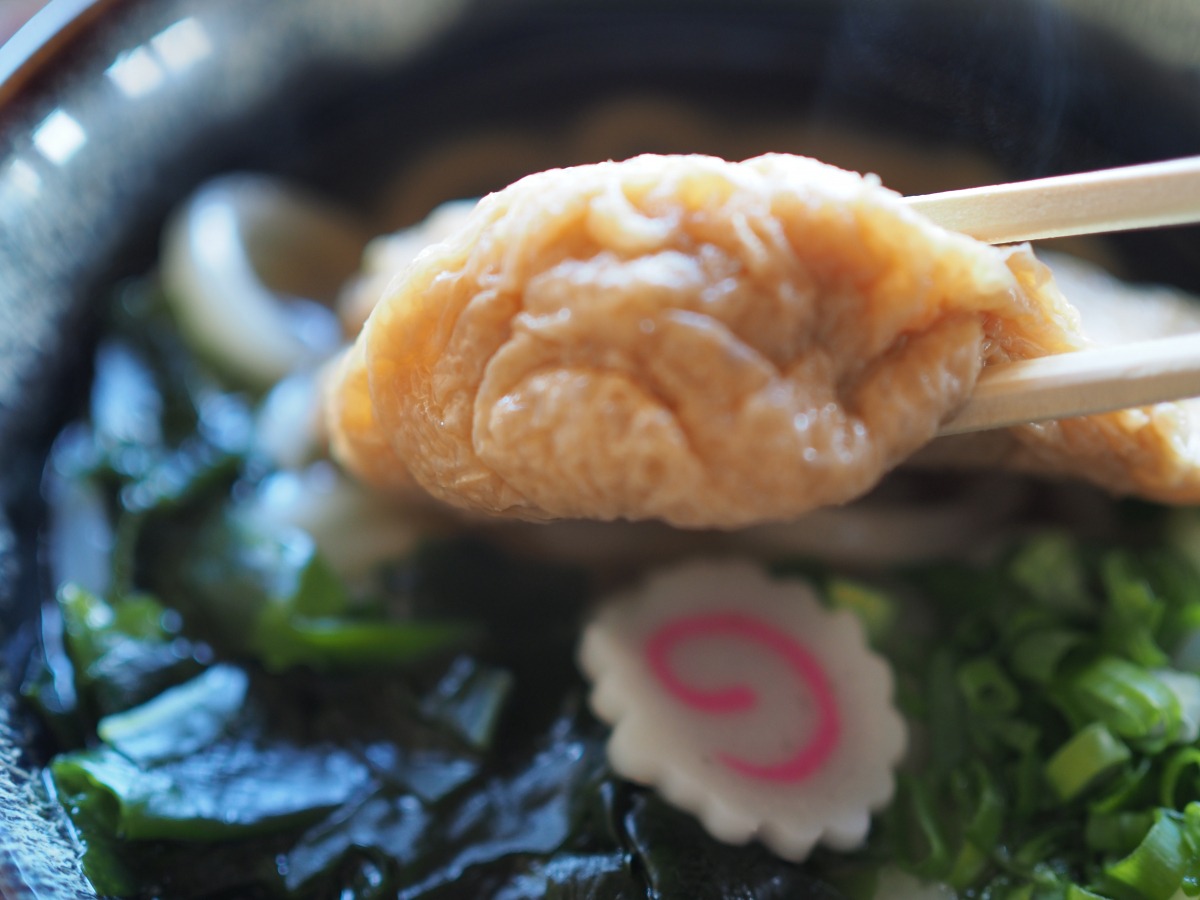 大きくて分厚いお揚げが載っていて、口の中にじゅわっと優しい甘さが広がり、とても美味しかったです。大きいから食べ応えも抜群!