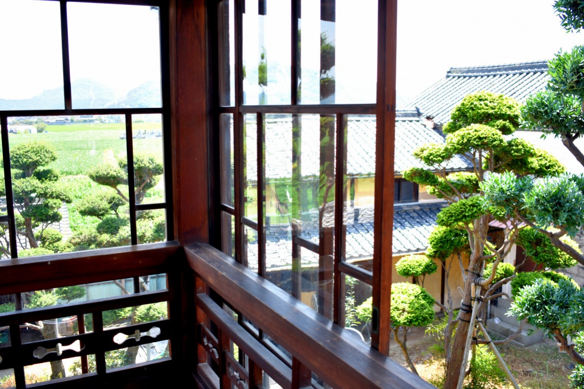 1階の渡り廊下やお庭、離れのガラス戸やトイレなど。細かいディテールまで堪能したら、2階ではどこまでも続く田園の美しい景色に浸りましょう!選び抜かれた建材やアート作品に囲まれて、心が満ちていくような時間が過ごせますよ。レトロ建築めぐりに史跡散策など、備前福岡をたっぷり深堀りしてみてくださいね。