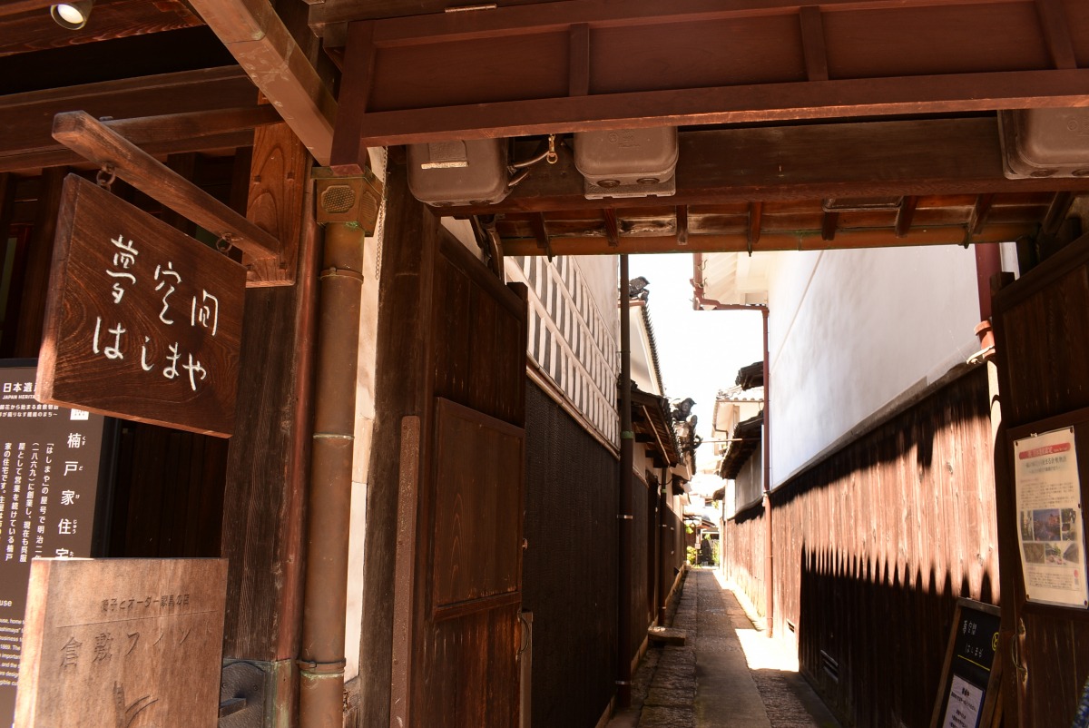 主屋のわきの倉敷ならではの細い路地「ひやさい」も、美観地区らしい風情がたっぷり。路の先には同じく登録文化財の米蔵があり、カフェ・ギャラリーとして活用されています。蔵に眠っていた食器でいただけるコーヒーはまた格別ですね。倉敷銘菓・藤戸まんじゅうとコラボしたスムージーなど、新メニューをテイクアウトしていざ路地めぐりへ!