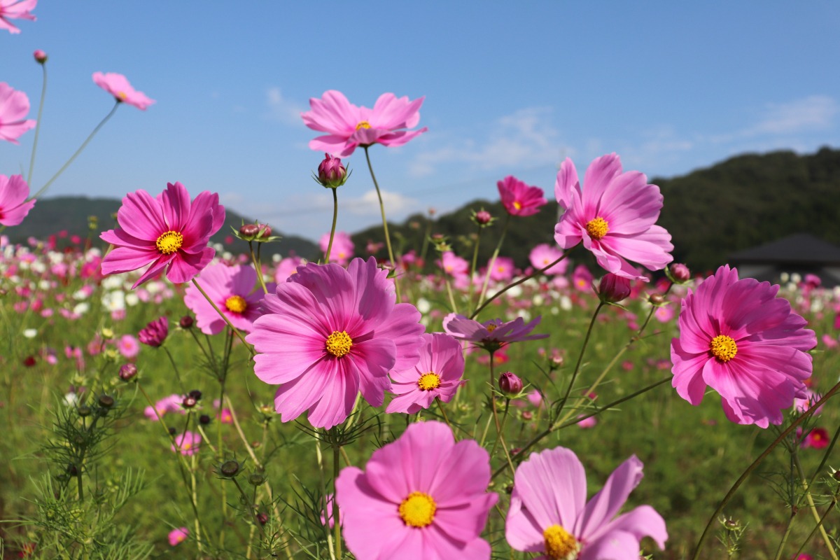 夏の暑さと、雨が少なかったため、コスモスの開花が遅れていましたが、真庭市北房のコスモスがきれいに咲きました。