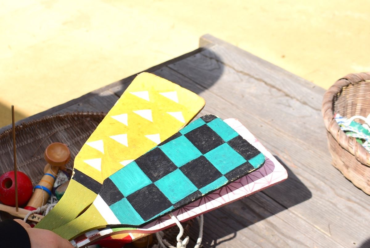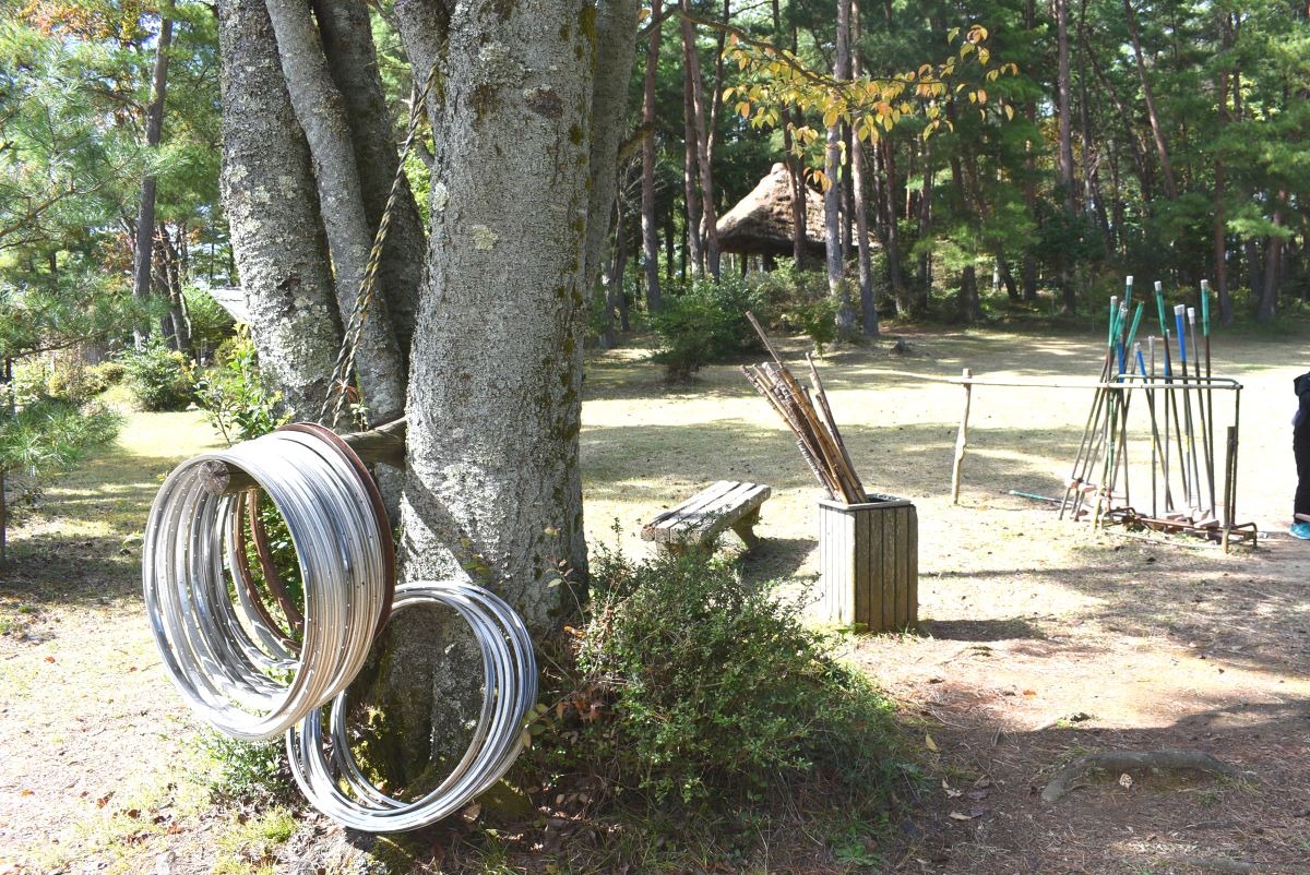 通りに置かれているコマや火おこしの道具などで、昔ながらの遊びも体験しましょう!羽子板が、あの鬼アニメのイメージ模様になっていたり。子ども目線の楽しみもいっぱいありますよ。すぐ裏の広場は星空の下でのコンサートも開始される広大な丘!大きな声で歌ったり、走ったり。帽子付きのドングリもいっぱい拾えます!