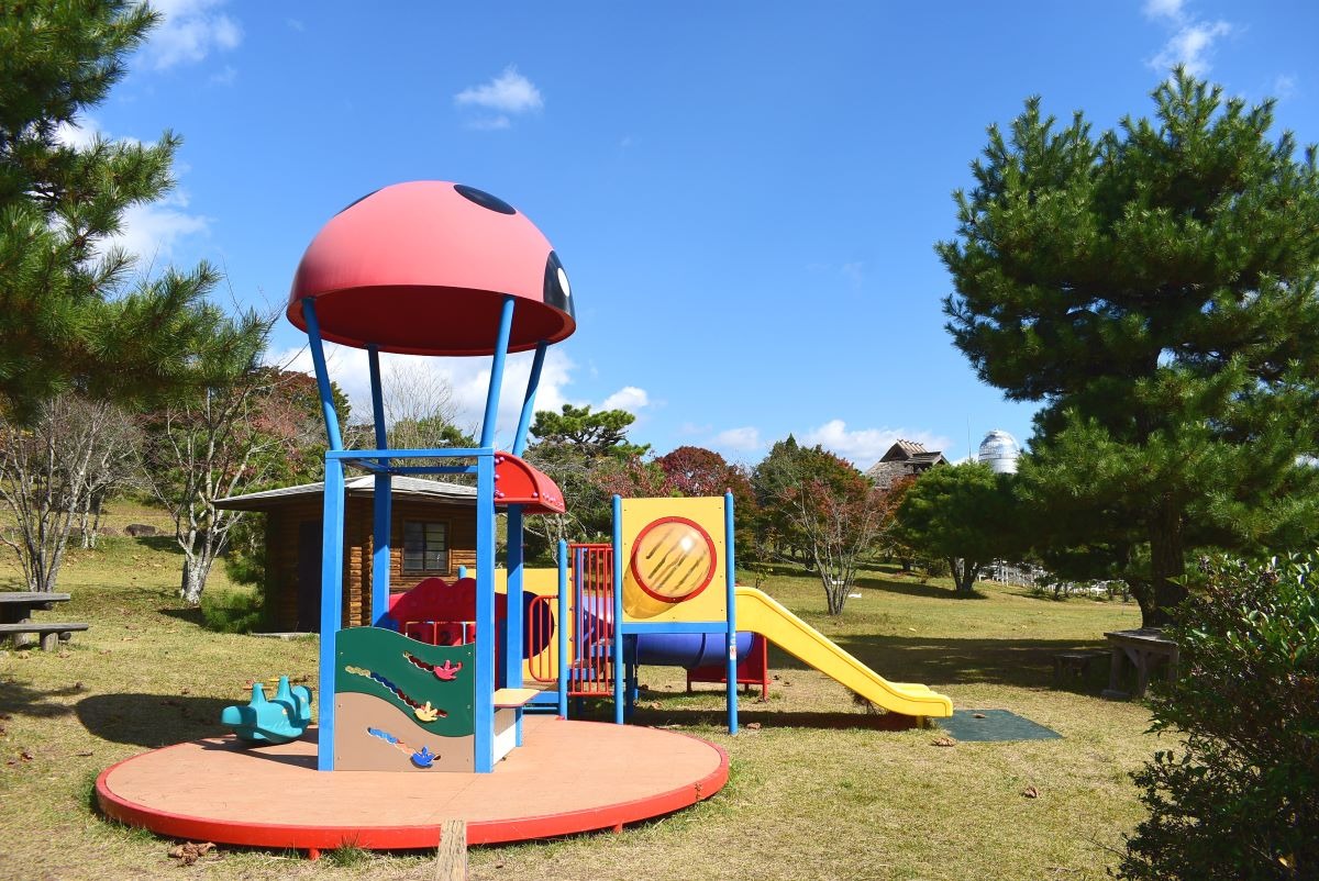 ジャングルジムにつり橋やロープ昇りなどが付いた、ちょっとレトロな遊具だけではありません。てんとう虫の複合遊具や、ニンジンを持ったウサギのスプリング遊具など!新しい遊具もそろっていました。ひょうたん型の池があったり、芝生にはバッタやトンボなど、かわいい虫たちもいっぱい!のんびり過ごせますよ。