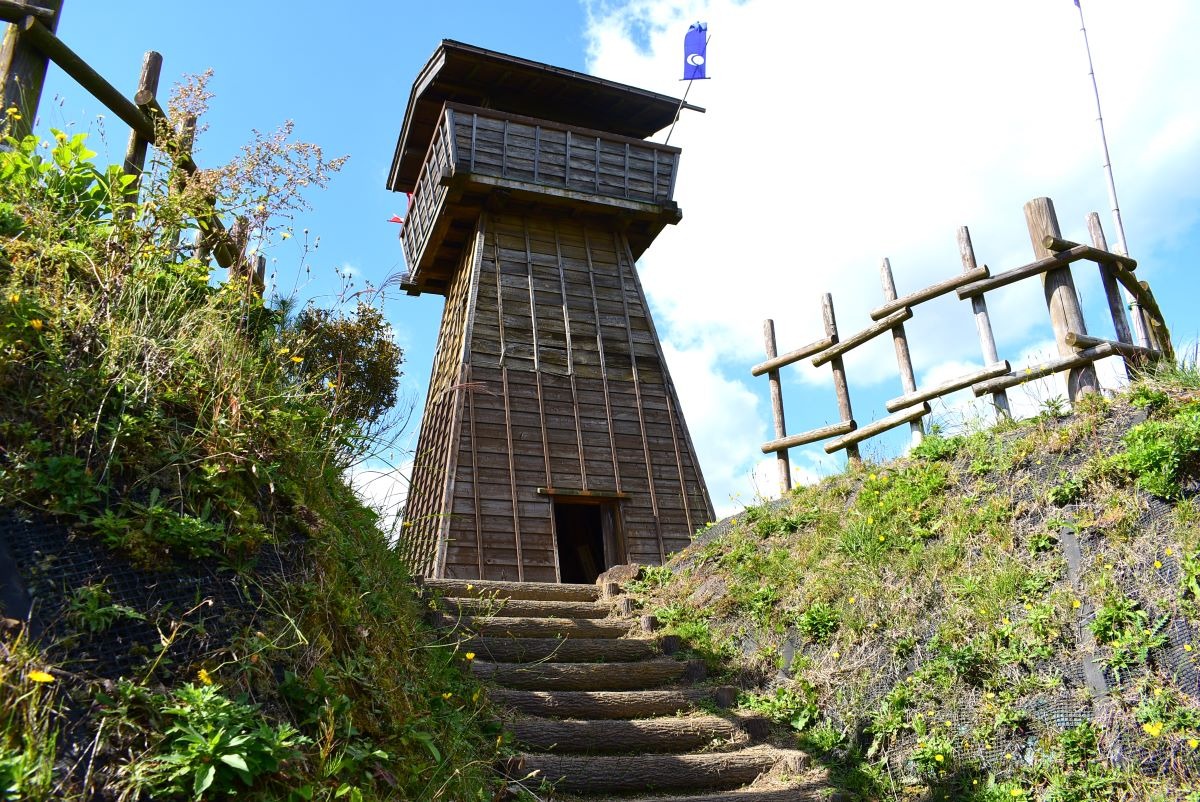 「景色がとっても良いので是非のぼってみて下さいね!」とおすすめされた物見やぐらへ!まだ石垣ではない時代の、自然の地形を利用した山城。まさに土の城と言ってもいいような、素朴さと野性的な出で立ちです。土塁の造形や、地下につながっている穴など。想像力がかきたてられるお城ですよ。