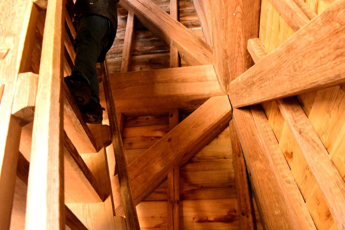 やぐらの中の階段の、角度がすごい!まるでハシゴのような傾斜です。ドキドキ。一段ずつ。ちょっとしたアトラクション気分が味わえますよ。でもしっかりした造りなので大丈夫。1人ずつ、ゆっくりマイペースにのぼりましょう。