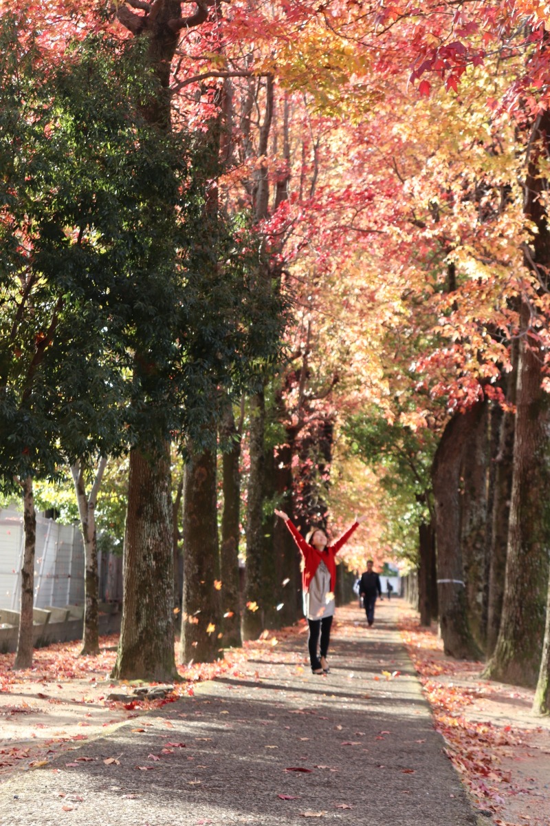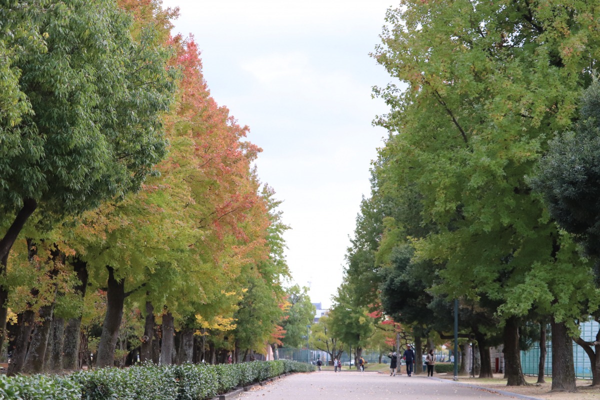 街中の岡山県総合グラウンドの街路樹が見頃を迎えています。日に日に赤みを増し、風に揺れて落ちた落ち葉の絨毯もきれいです。毎日変化していく紅葉の移ろいをの中を散歩がてら歩くのもおすすめです。