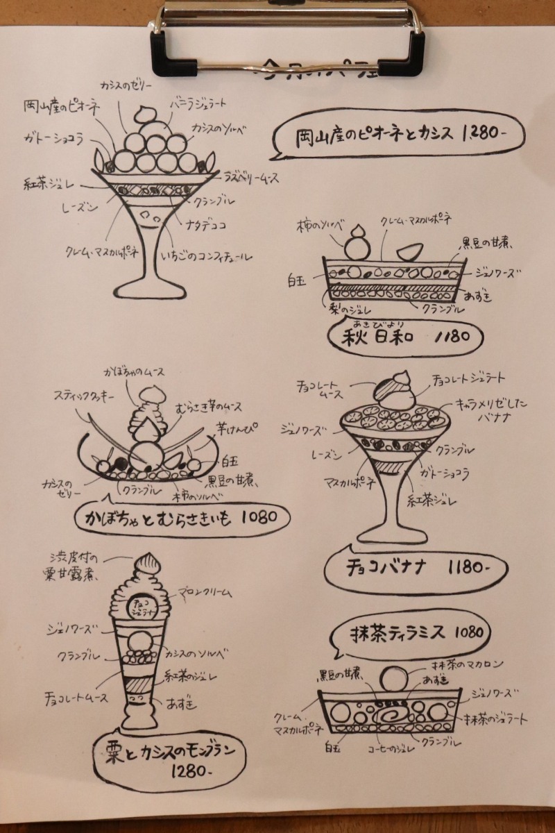 1つ1つの材料を厳選して、手作りで作り上げられているそうです。秋は岡山ならではのぶどう、柿、栗を使ったパフェがおすすめです。器にもこだわられていて、季節の果物を選び、食感や香りを考えながらパフェのデザインを考えて作り上げていかれるそうです。インスタグラムで斬新なパフェを目にして、ぜひ行ってみたいと思っていました。