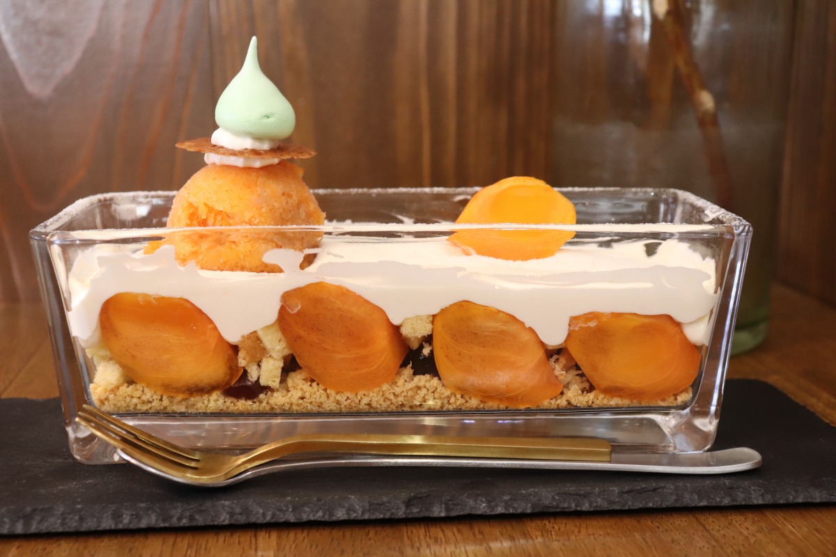 オレンジ色の柿が秋らしく映える横長のパフェをオーダーしました。秋から冬になり、雪景色をイメージして白のクリームの上に秋のオレンジのシャーベットをのせられたそうです。クリームの下には梨のジュレ、小豆と白玉が入っていて、焼き菓子と生菓子の食感の変化を楽しめるようになっていました。柿のオレンジが映えて目を引きました。器も横長で和風な感じがしました。ボリューム満点です。