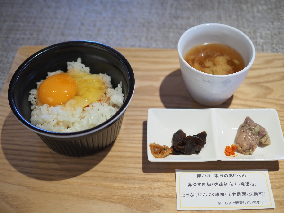 9時から営業しているカフェでは数量限定のたまごかけごはん(500円税込)を食べることもできます。こひよ内2階にカフェスペースがあるので、そこでいただきました。