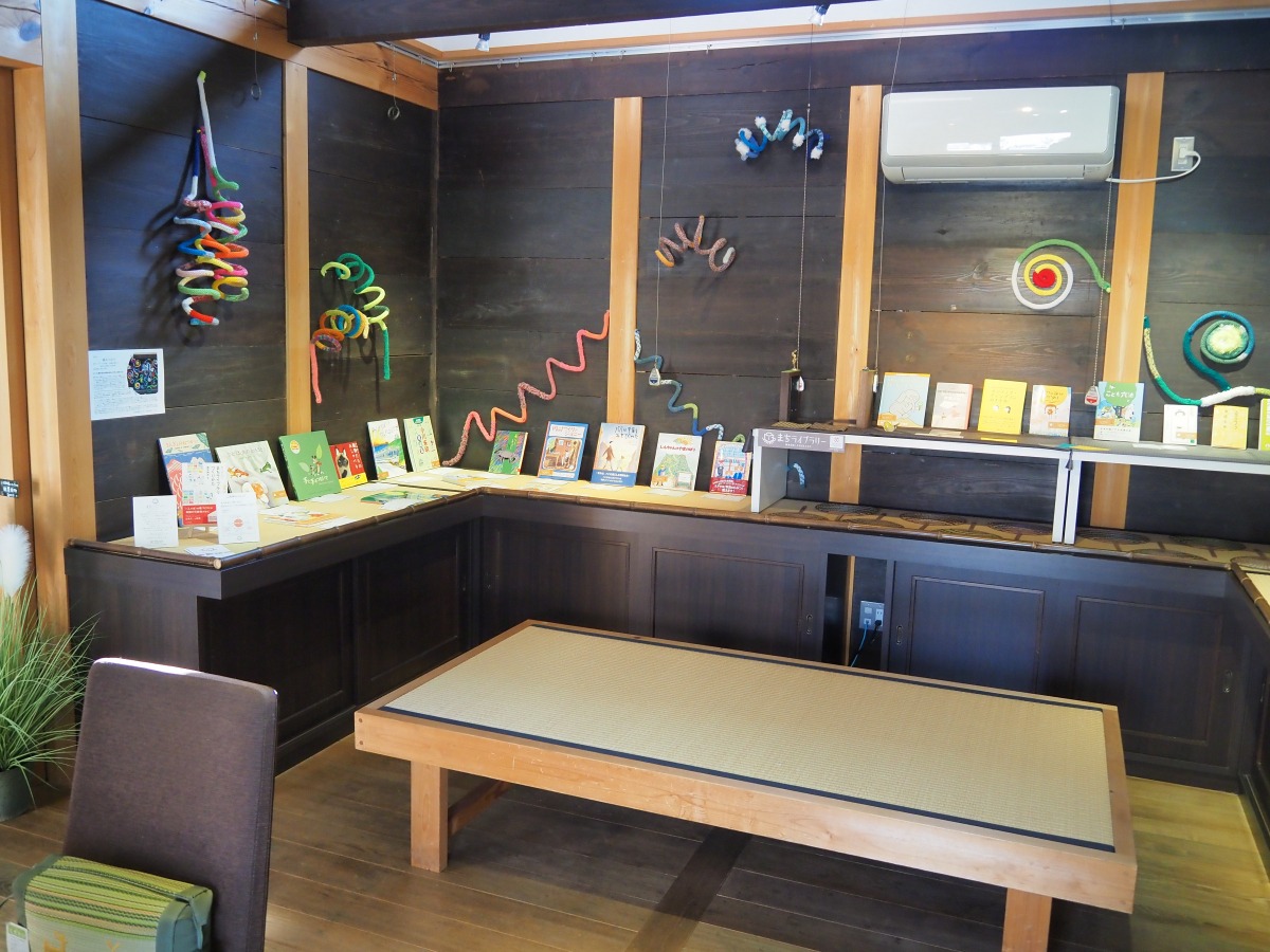 早島町観光センターには、小さなお子さまと子育てママが一緒に楽しめるよう、絵本や子育ての本などが並んでいます。本を寄贈してくださった方からのメッセージも一緒に展示してあります。畳のベンチで読んだり、図書館のようにレンタルすることもできます。