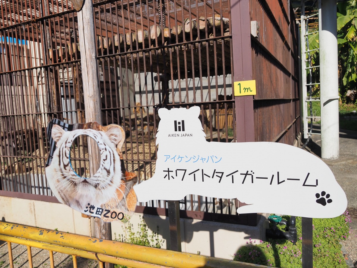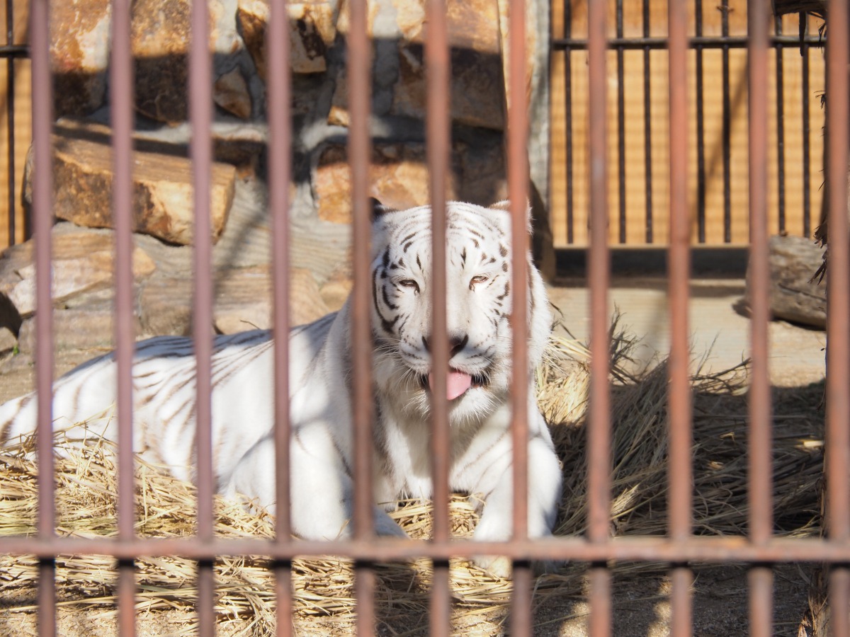まずはホワイトタイガーのサンちゃんです。入口を入ってすぐの場所にいる、池田動物園のアイドル的存在。2013年3月16日に埼玉の東武動物公園で誕生し、2019年4月14日に池田動物園にやって来ました。