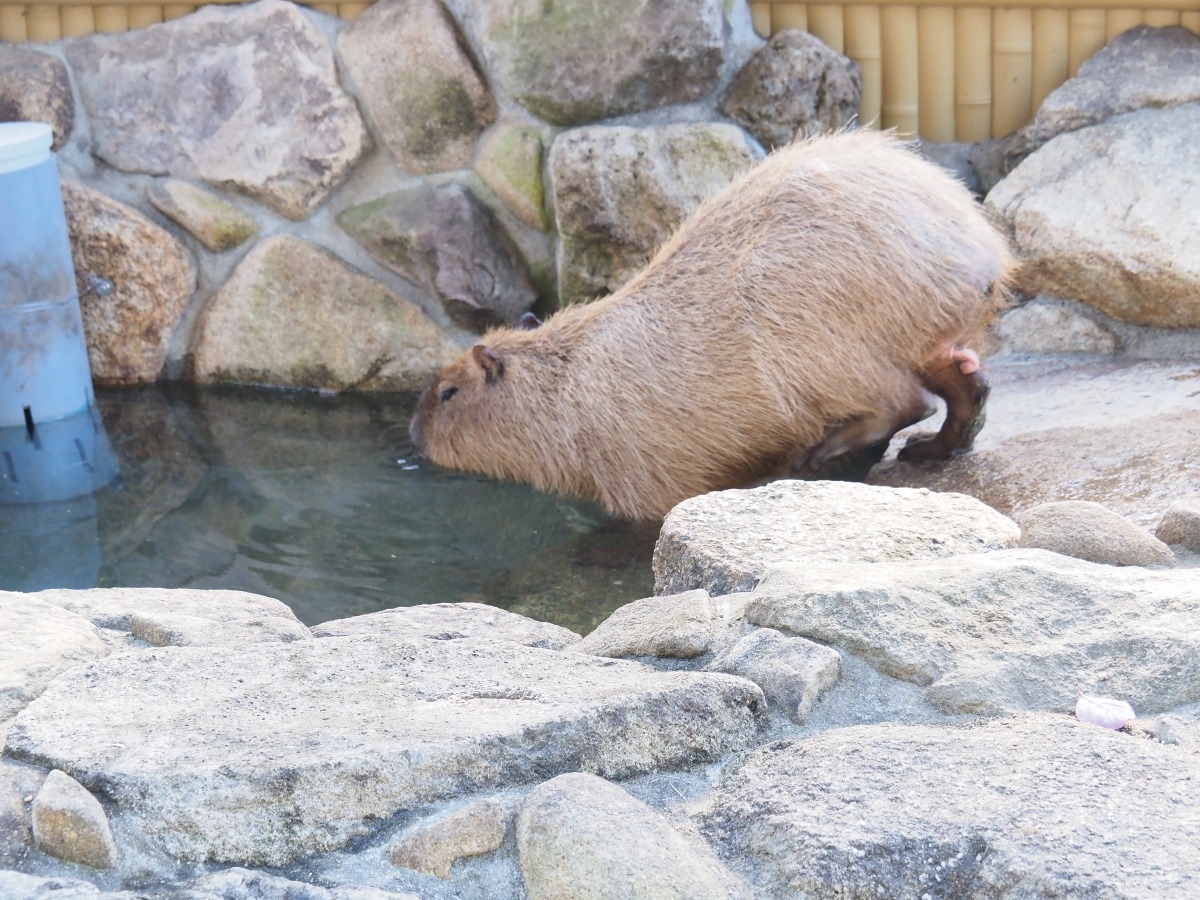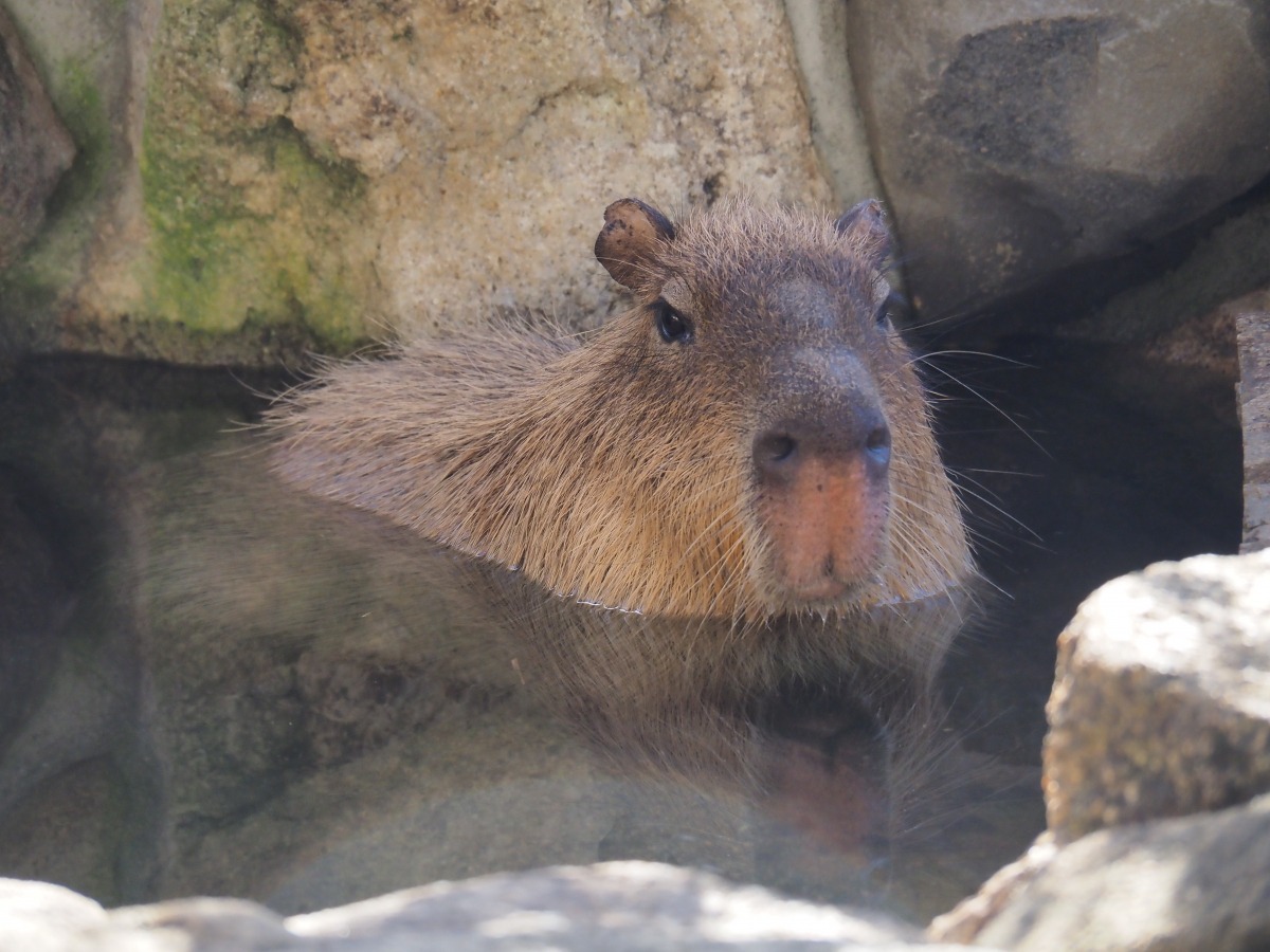 山を下りたところにカピバラがいます。のんびりした表情が魅力的ですよね。