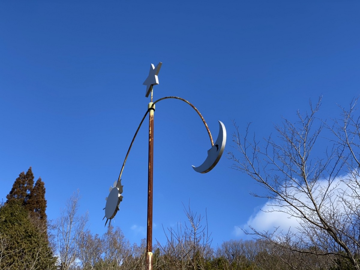 真星 星の村キャンプ場は、入口にある星・太陽・月の飾りがついた大きなヤジロベエが目印です。管理人さんお手製で、大きさは約14mとのこと!