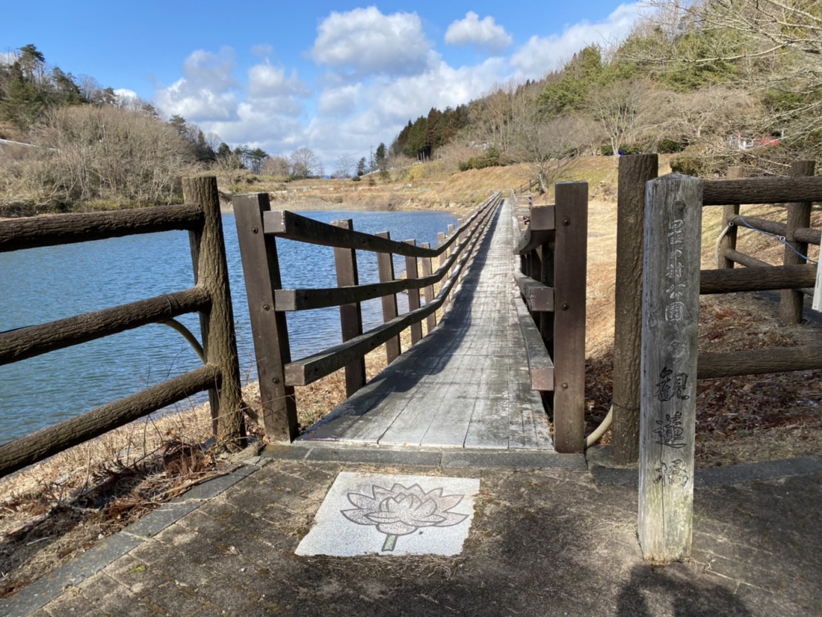 キャンプ場から見渡せる「白土池」には散策用のデッキが備わっています。その名も「観蓮橋」。