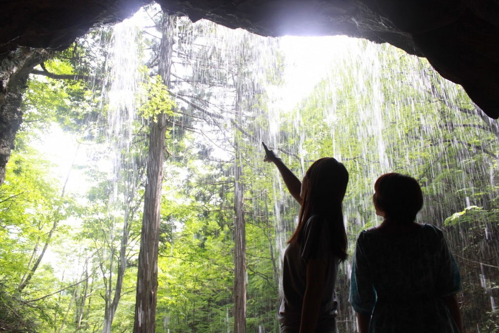 滝の上部に岩盤が突き出ており、滝の裏側に入れます。流れ落ちる清水はまるで水のカーテン!ふもとに湧く名水百選「岩井」は子宝の水として親しまれています。