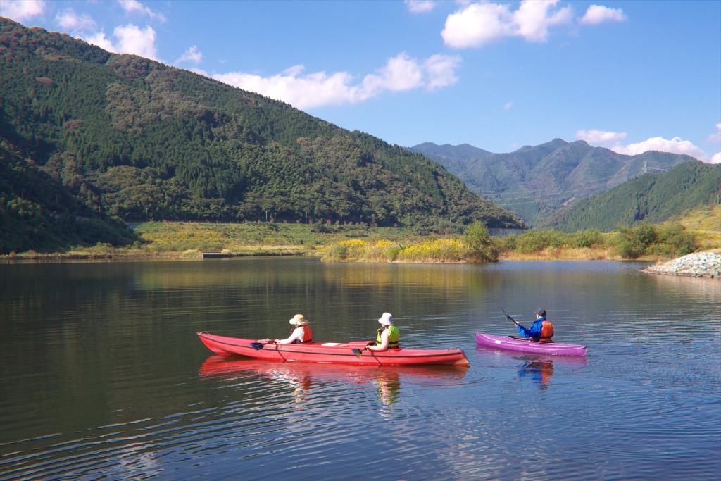 壮大な湖でカヌー体験!心地よい風を感じながらパドルを操って奥津湖の大自然を満喫しよう。また、奥津湖周辺には、湖岸道や公園、案内所も整備されています。