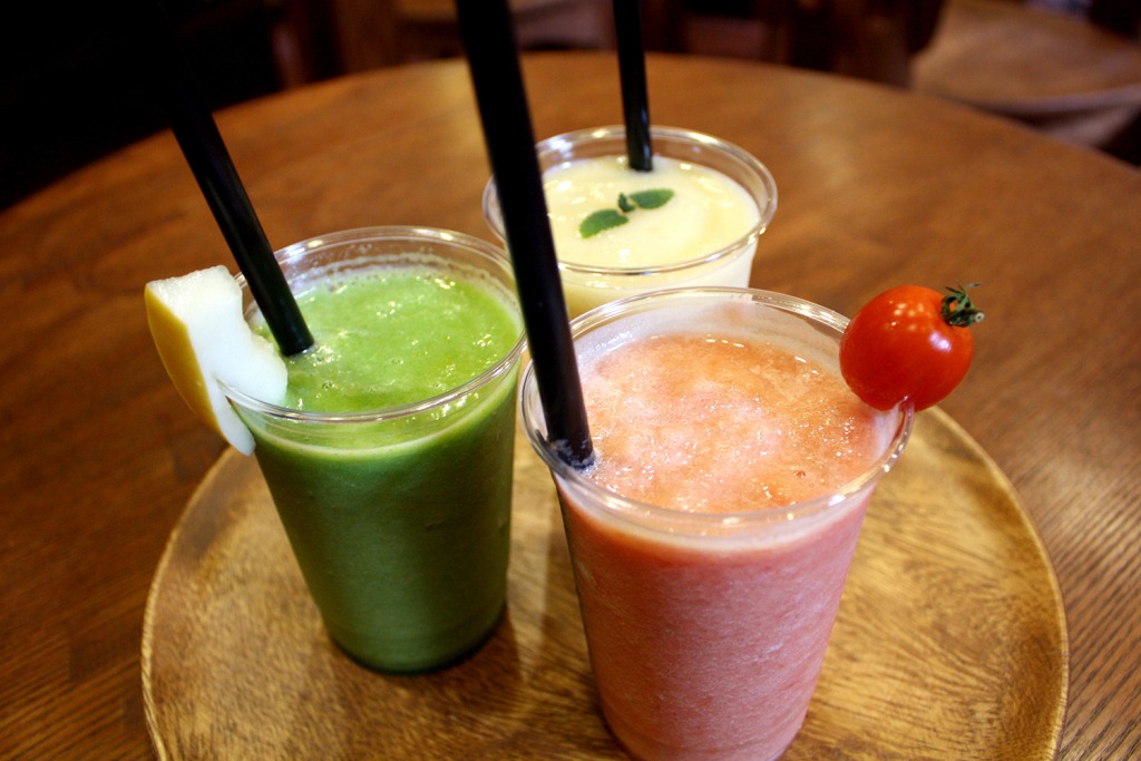 奥津温泉「花美人の里」内にあるカフェ。絶妙な甘みと香りのトマトと山田養蜂場のはちみつを使用した「里山レッド」をはじめ、いちごやピオーネなどフルーツを使ったスムージーを味わうことができます。