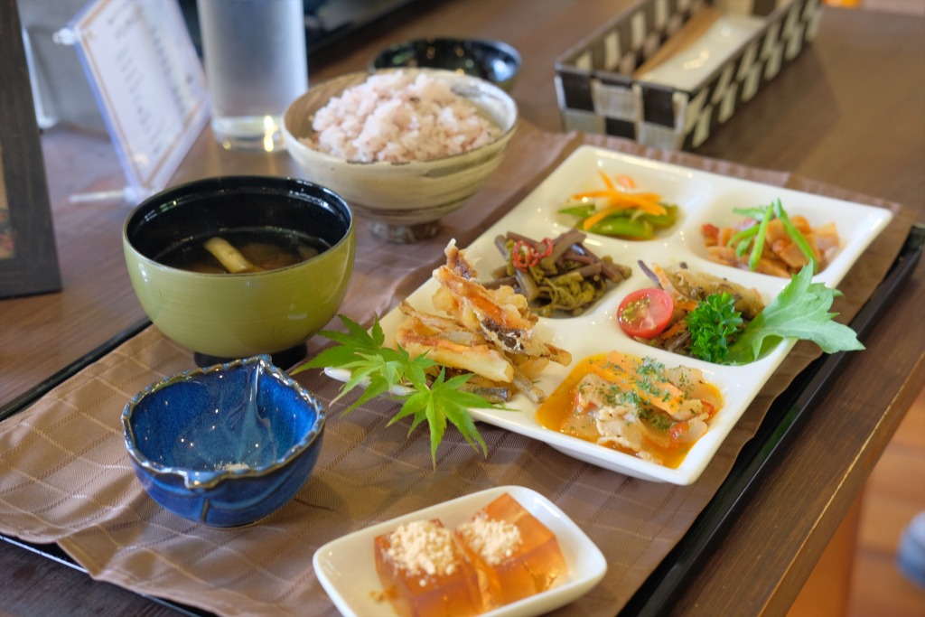 奥津温泉「花美人の里」内にある、「かがみの里山レストランAelu」では、鏡野町の山の幸、川の幸を使った里山料理を味わうことができます。