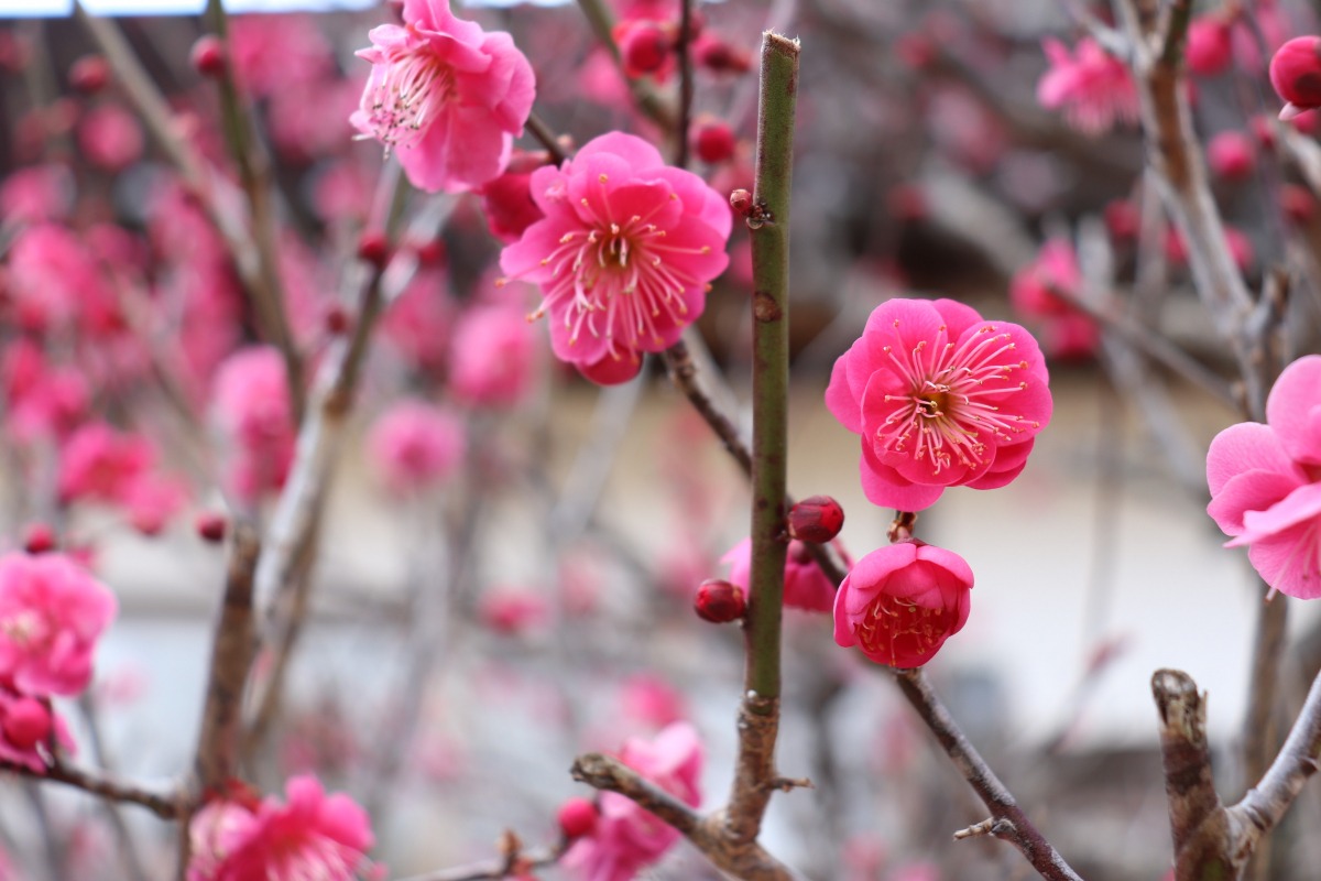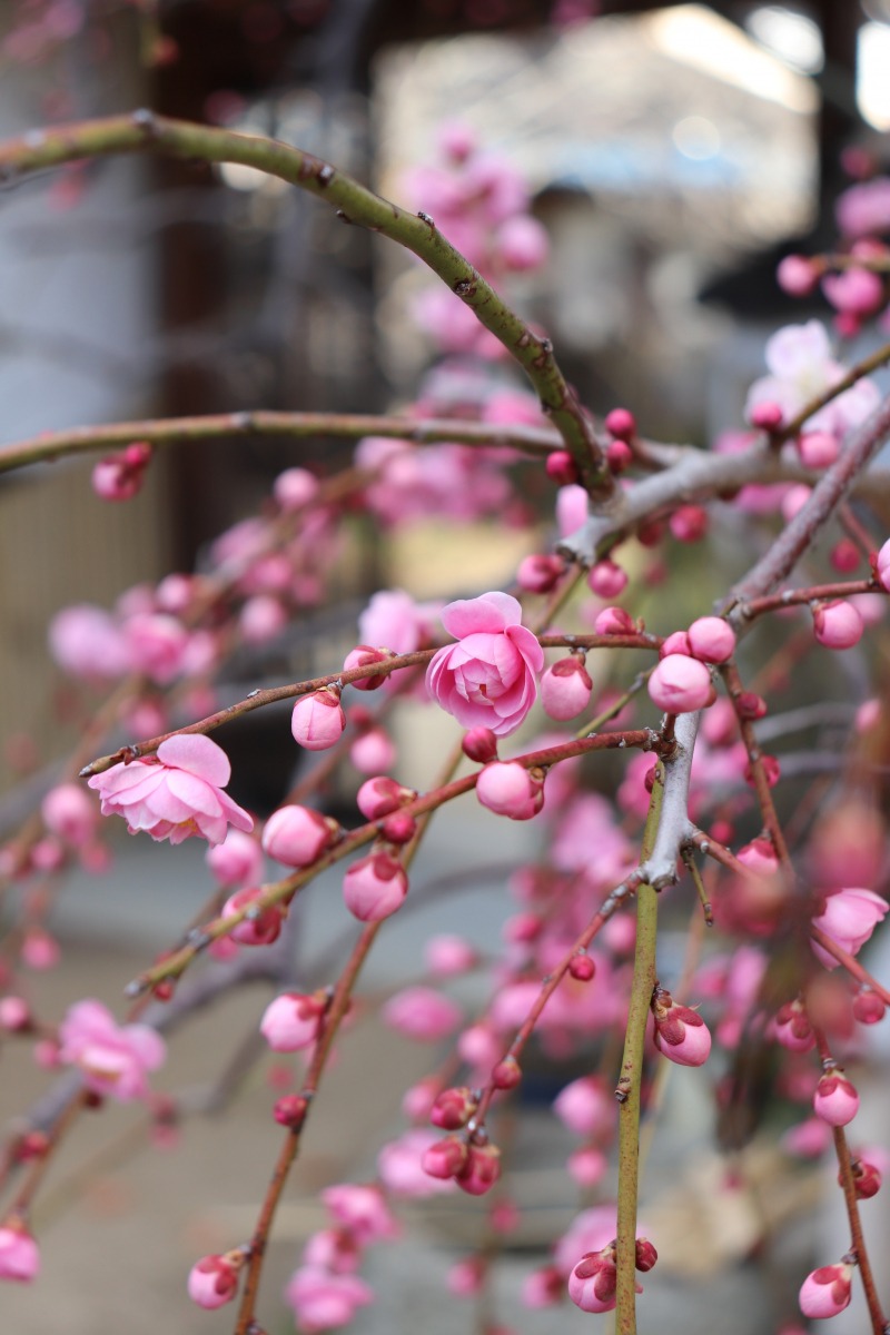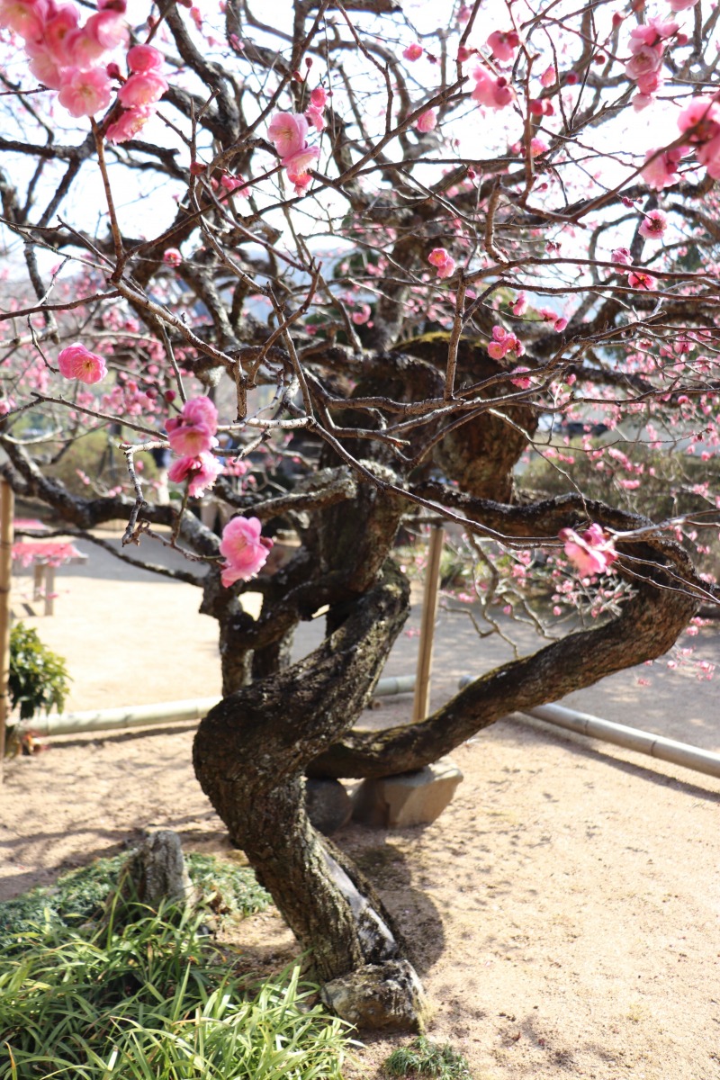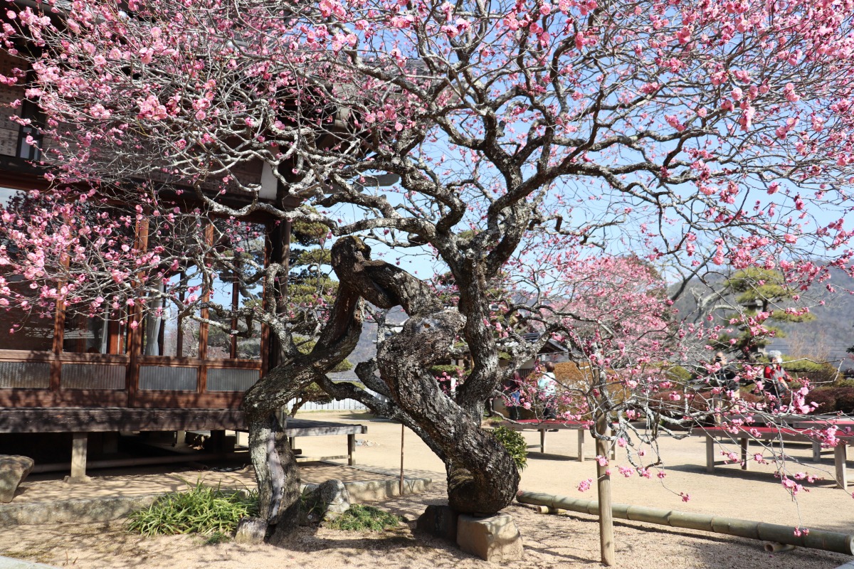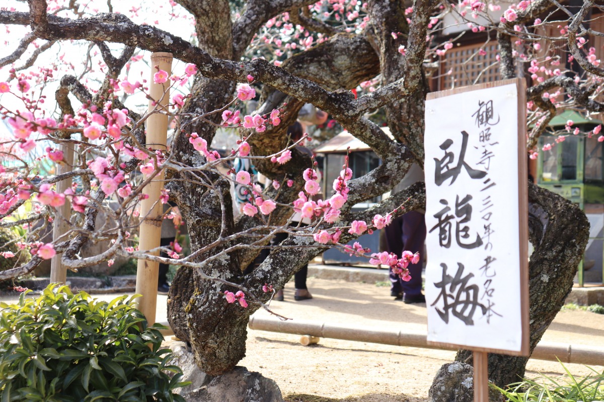 急に暖かくなり、梅の見頃が一気にやってきました。梅のお寺で有名な観照寺(かんしょうじ)は、ピンク、赤、白の色とりどりのきれいな梅が咲くお寺です。本堂横に建つ、樹齢200年を超すといわれる「臥龍梅(がりゅうばい)」が2月14日頃に見頃を迎え、次々に梅の木が開花を迎えています。「臥龍梅」は、うねるように伸びて巻き付いた幹が、竜の姿に見えることから名付けられました。