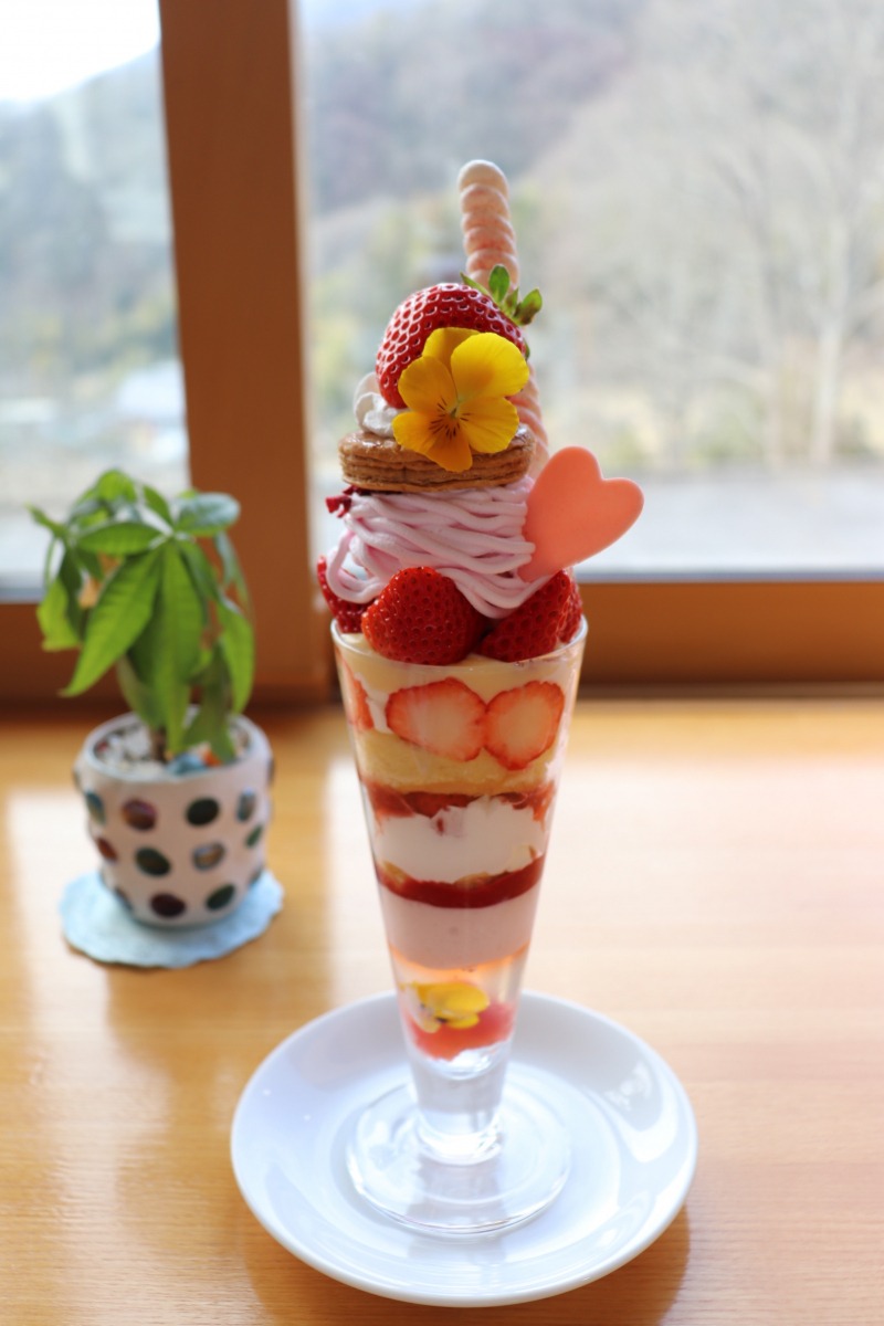 フルーツトピア内で採れた“さがほのか”と県内産の数種類のイチゴで作られたこのパフェ、いちごのムース、ソルベ、クリームといちごづくしですが、甘さ控えめでさっぱりしていたので、意外に軽く食べれました。真ん中には、ショートケーキのような味わい、一番下には、エディブルフラワーといちごが浮かんでいました。見た目にも十分満足感がありました。予約がおすすめです。(税抜き1800円)他にも色々なサイズのパフェがありました。