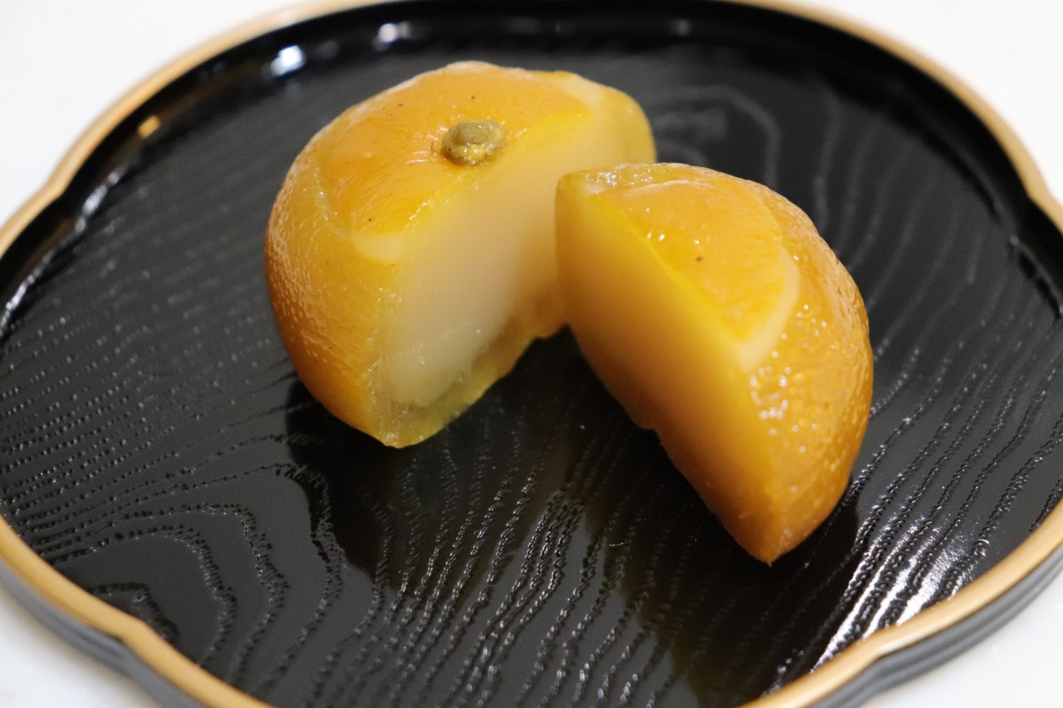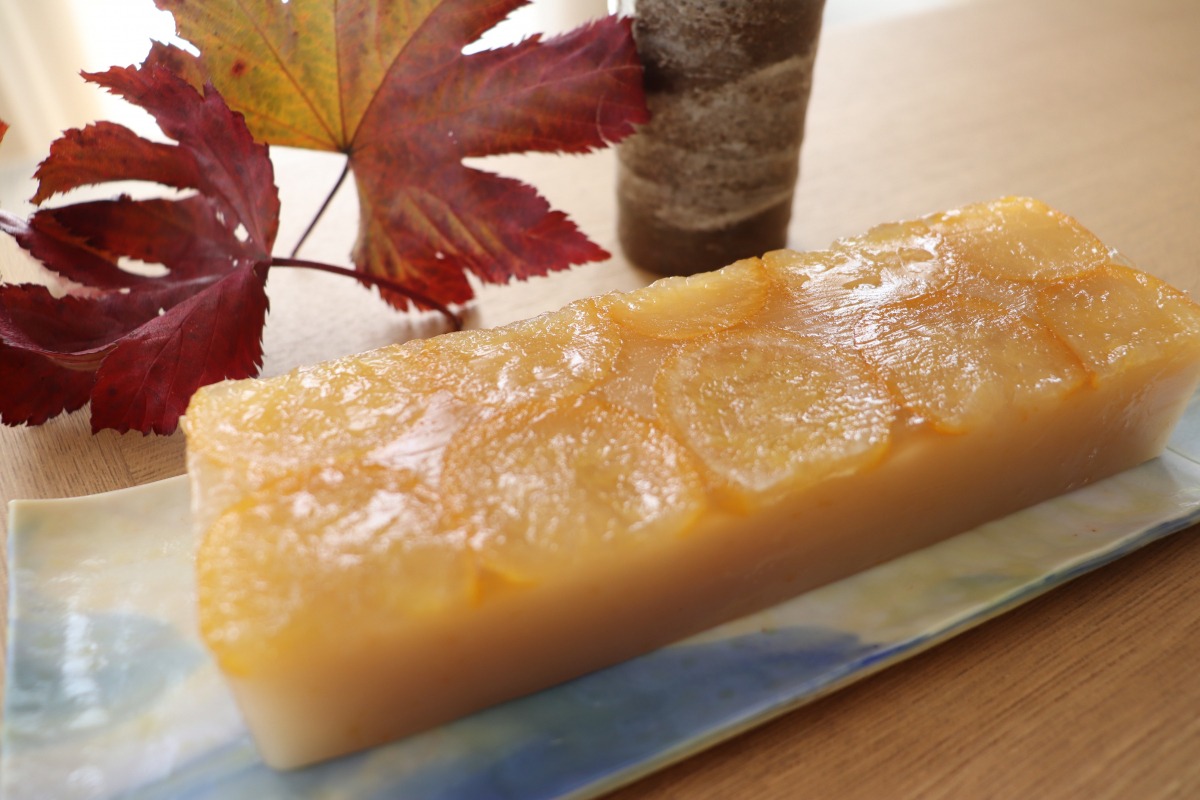 佐藤玉雲堂さんの「柚子羊羹」を見た時、「お取り寄せしてでも食べてみたい!」と思ったくらい、きれいな柚子羊羹でした。8代目の佐藤映子さんが、柚子の痛みを一つ一つ削って、煮詰めて、きれいなところだけを羊羹の表面に並べられているそうです。手間がかかるため、大量生産は出来ないそうです。土台は、白あんで柚子との相性も良く、甘酸っぱさと程よい甘さがくせになります。(税込1,260円)