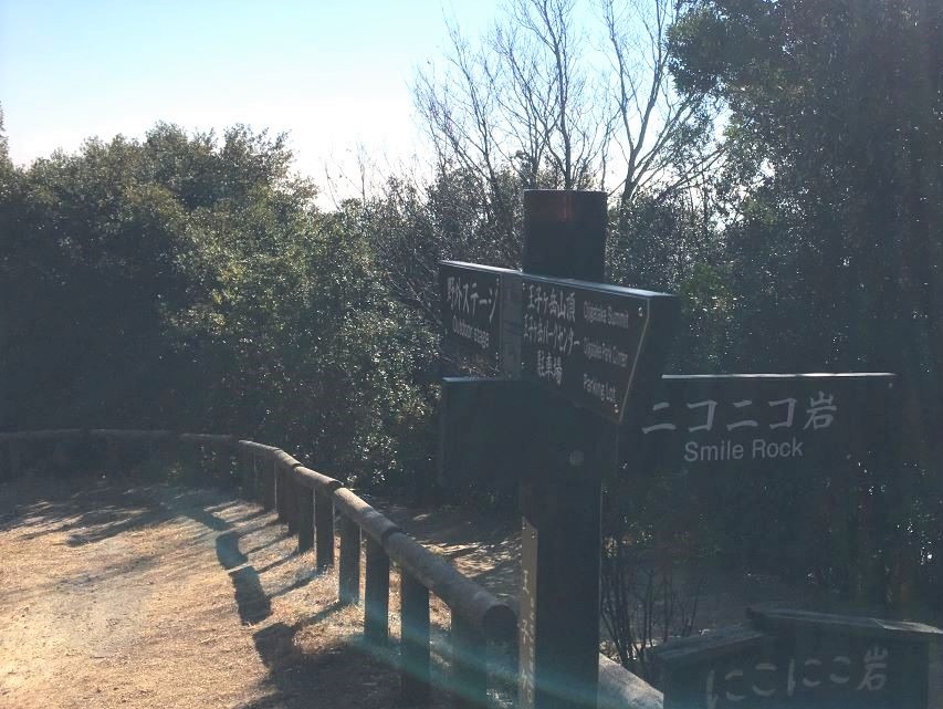 山の上は歩きやすい遊歩道になっていて、好きなルートを選ぶことが出来ます。ニコニコ岩へは、ひたすら海沿いへ!サザンカの花や、上空を回旋するトンビ。道しるべに従って、自然を感じながらのんびりと歩いて行きましょう。