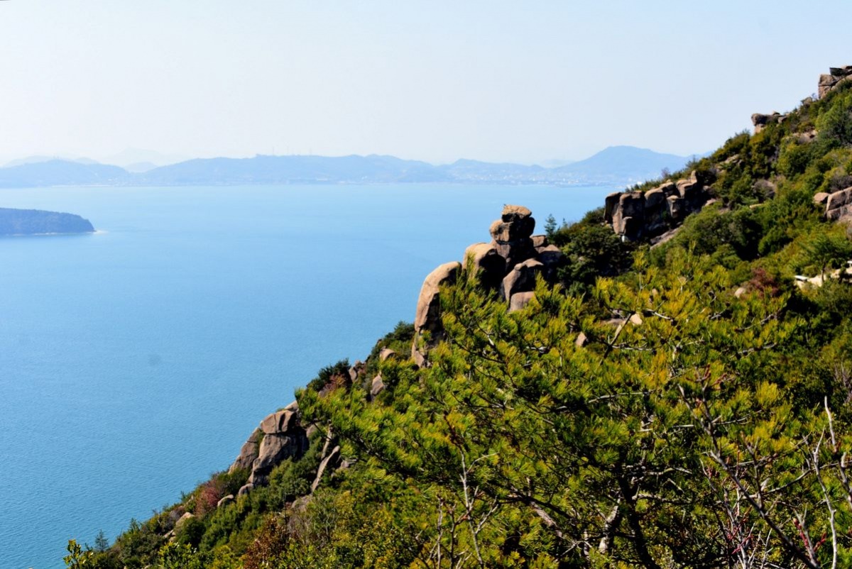分度器で測りたいほどの急斜面ですよ!のどかな瀬戸内海と、奇なる岩々。穏やかさと野生さのコントラストが、王子が岳ならではの魅力です。児島方面には、おだんご岩と、おだんごを狙う!?ねずみ岩!そして、グランピングも出来る貸切無人島・くじら島の素敵なビーチまでも良く見通せます。