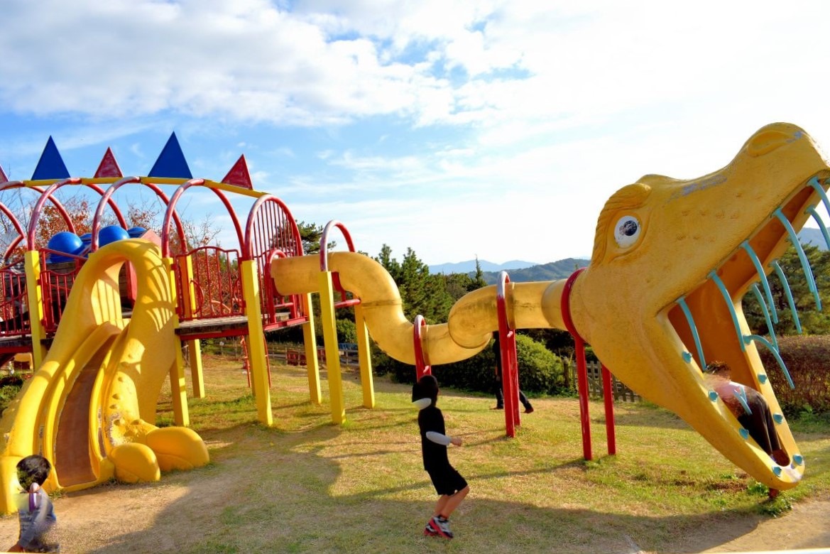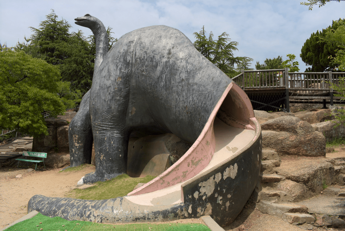ウルトラ怪獣?トリケラトプス!?愛嬌たっぷりの三角竜が、公園の茂みに潜んでいます。懐かしいレトロ遊具がそろっている小さな公園ですが、山の角度に沿ったローラー滑り台はスピード感ありすぎ! 乙島祭り(10月の最終土・日曜日開催)で有名な戸島神社にもお参りできます。