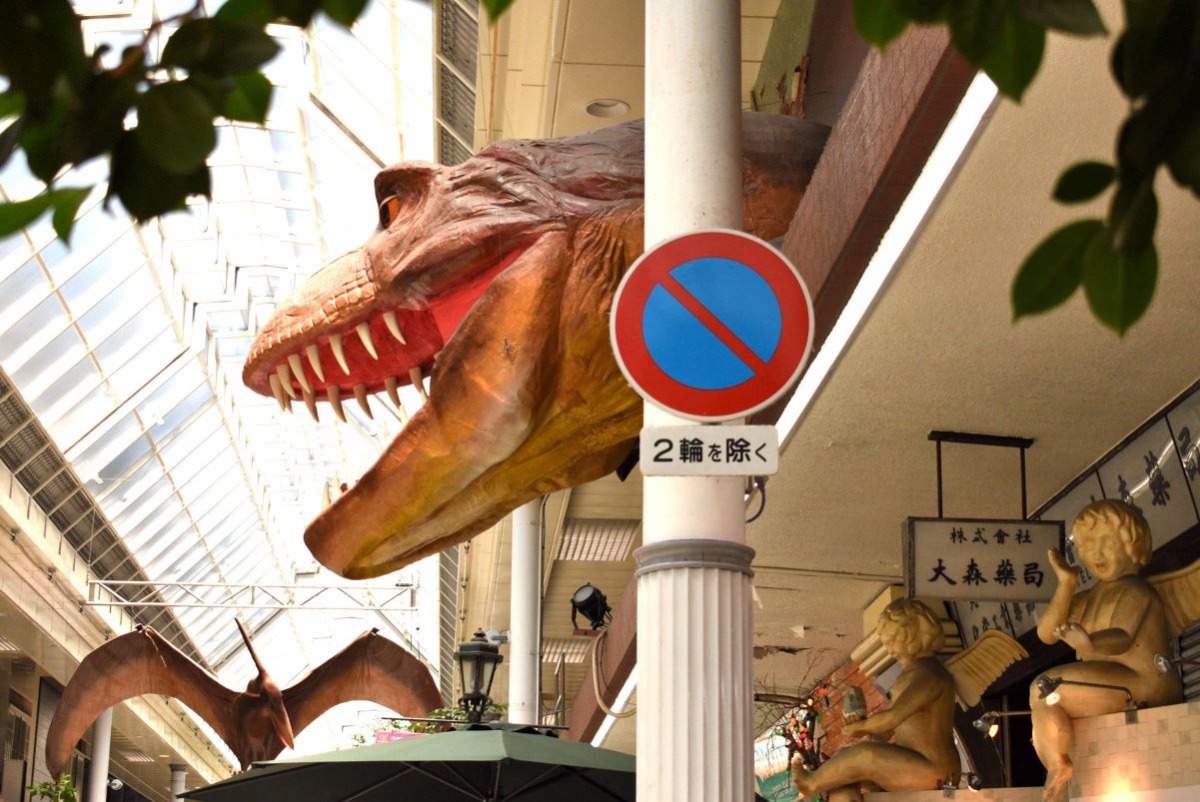 でっかい頭が壁を突き抜ける! 表町商店街アーケードの人気フォトスポットです。牙をむくティラノサウルス VS 天井いっぱいに翼を広げるプテラノドン! 卵から孵ったばかりの赤ちゃんをめぐるドラマまで想像して楽しんじゃいましょう。200店舗以上が軒を連ねる、めぐり甲斐ありすぎな商店街です。